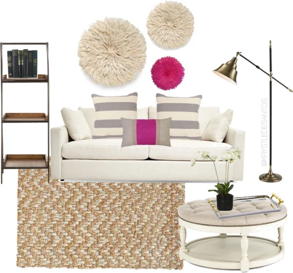 The second board is a bit more traditional but I funked it up with pops of pink in the Juju hat as well as throw pillow. I kept a little gold in the space for a touch of glamour but also styled it to feel cozy and relaxed. Grab a blanket and a cup of tea and snuggle up on that sofa.
