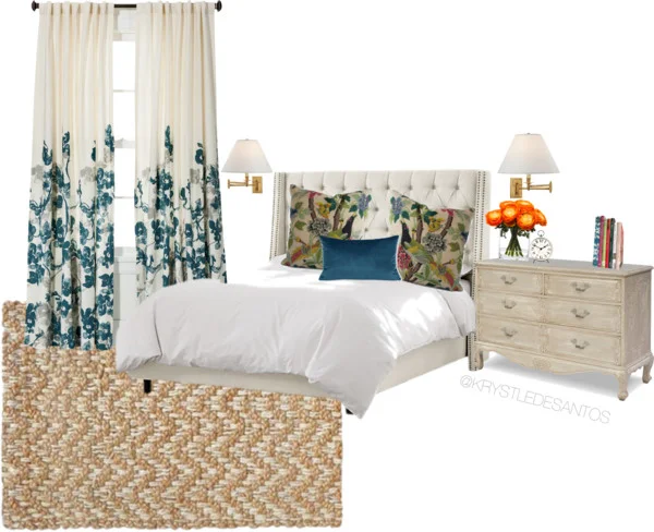 The final board plays off florals and birds. I love how the colors in the pillows pop against that beautiful tufted bed. I mixed floral prints in similar color palettes and complemented that with orange ranunculus. This board features silk ranunculus but I prefer fresh flowers as they add life and fragrance to a space. They're such a treat!