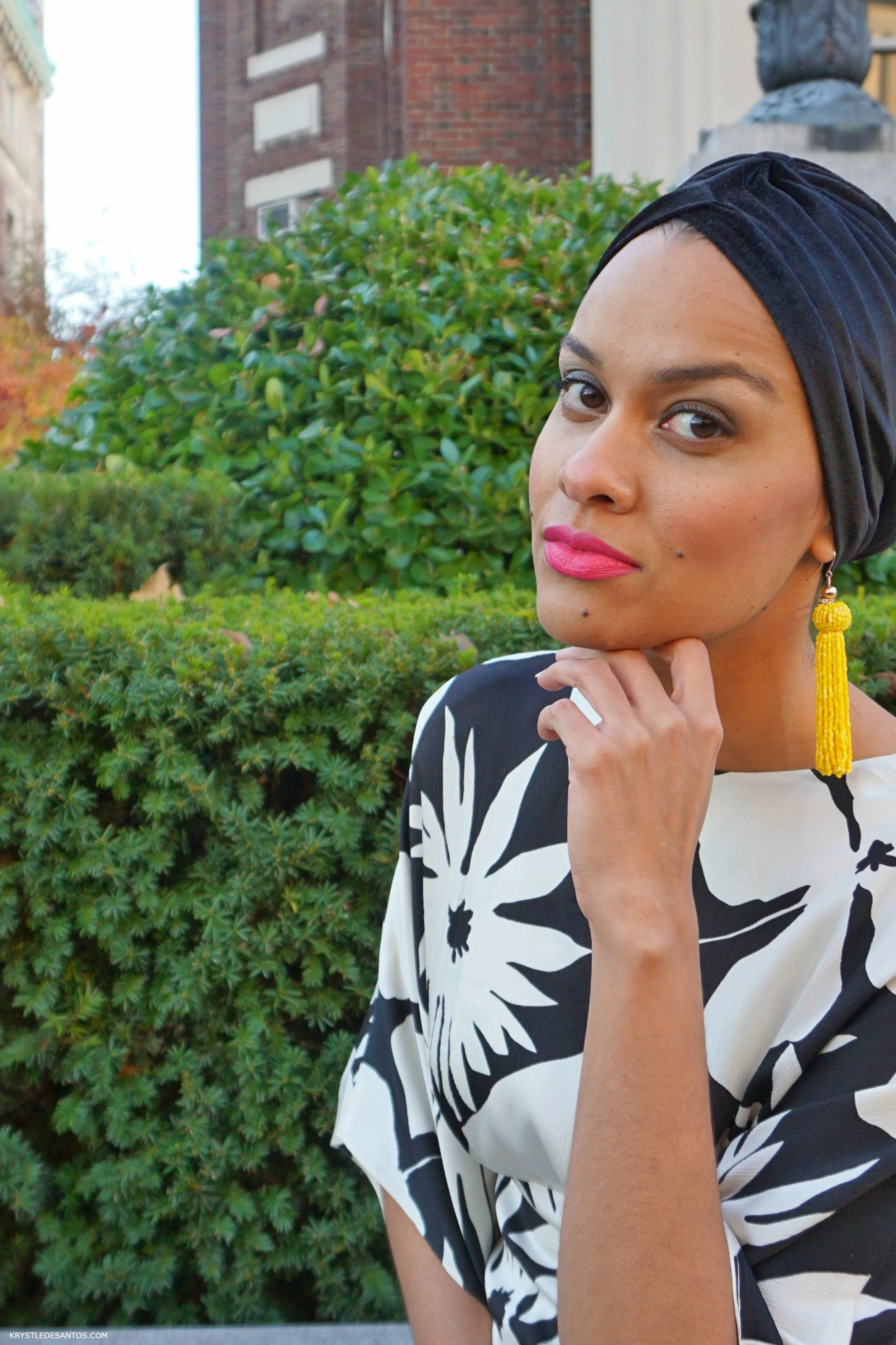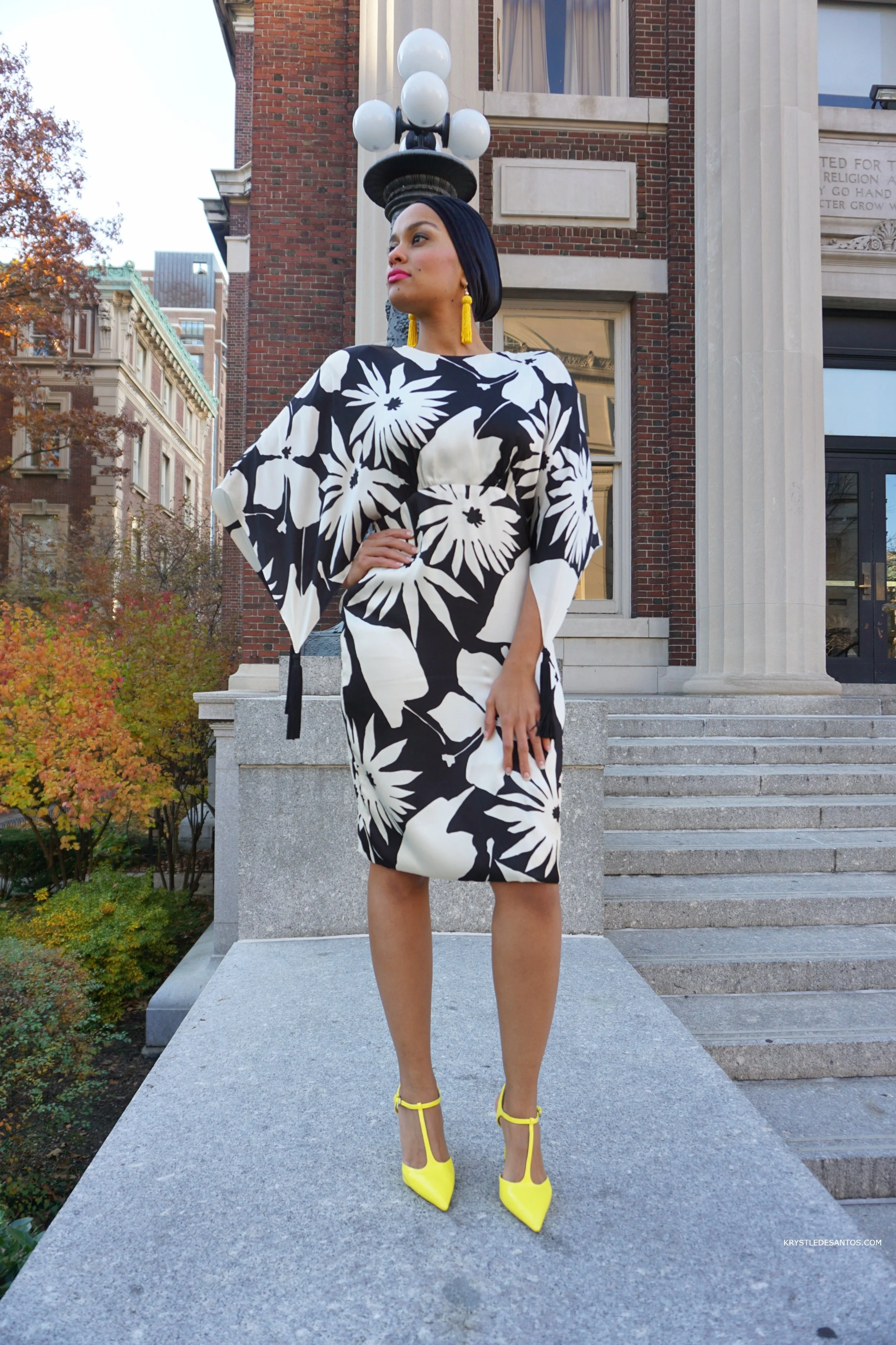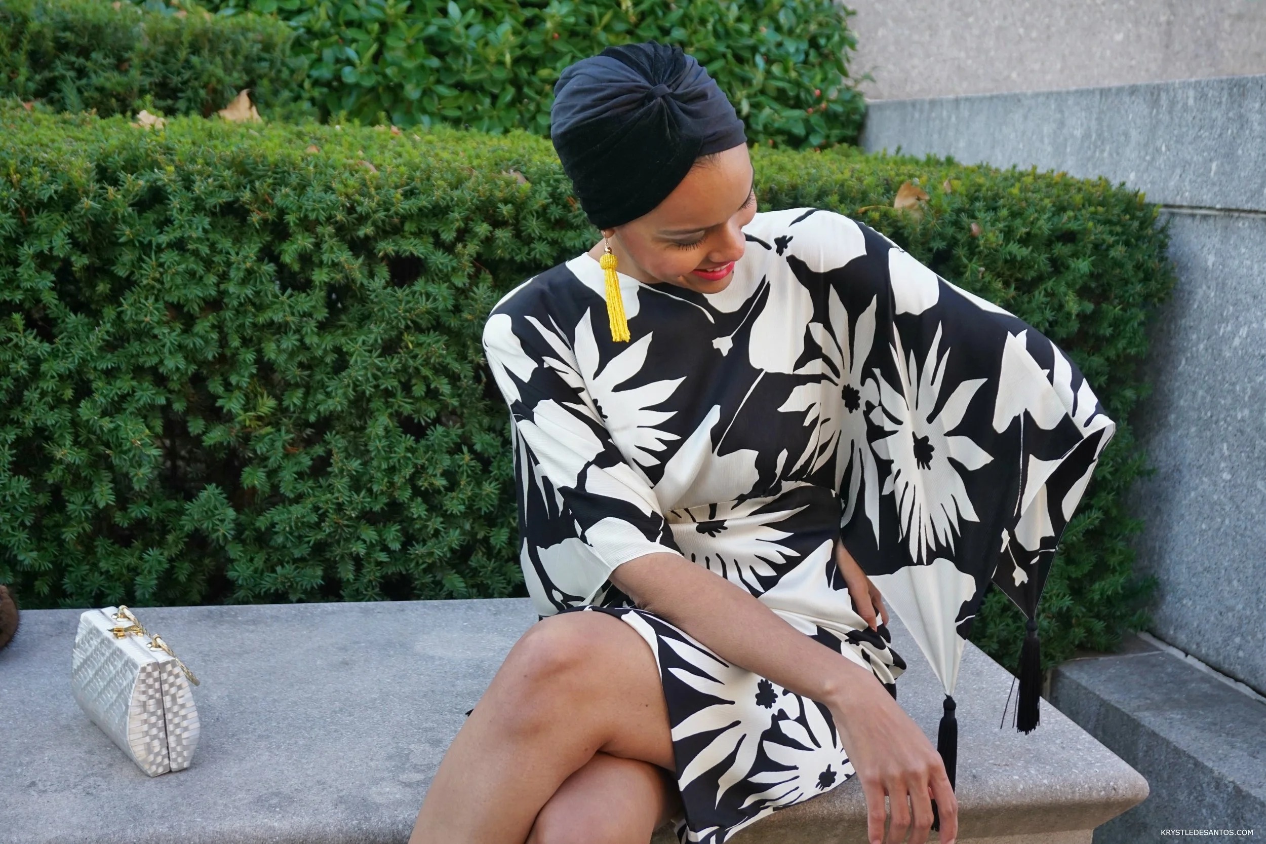 I styled this beautiful black and white floral silk kimino dress with a black velvet turban and yellow beaded tassel earrings for my signature retro-glam look Turbans and Tassels!