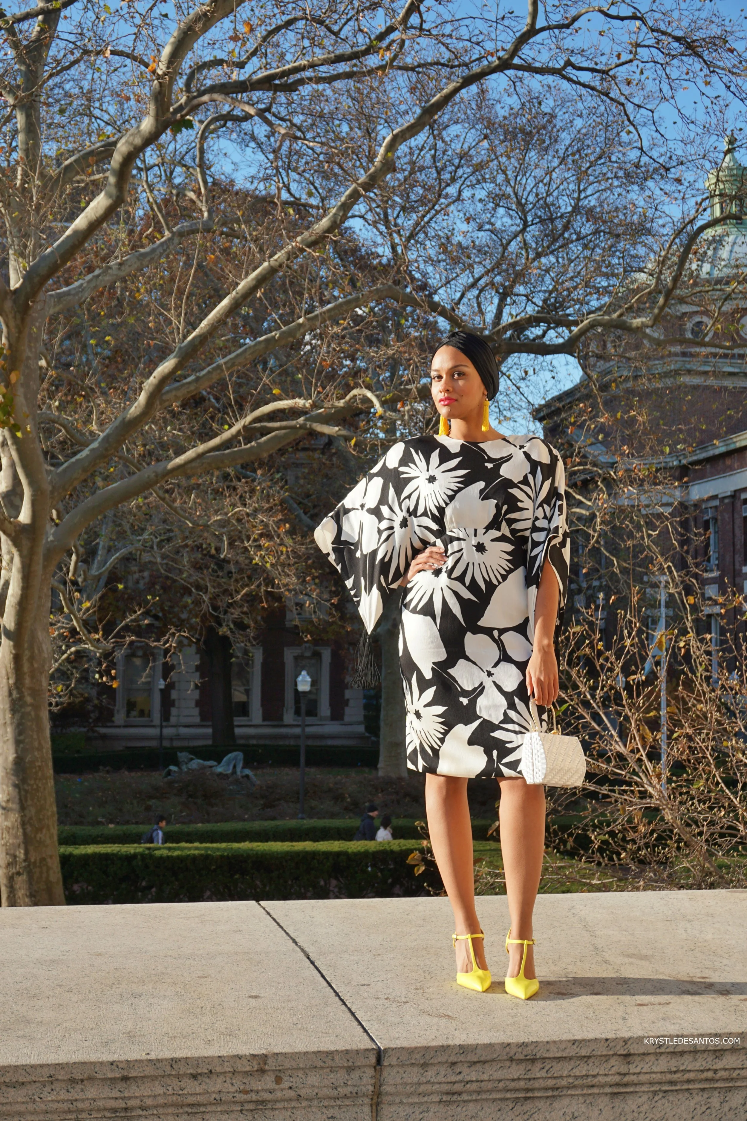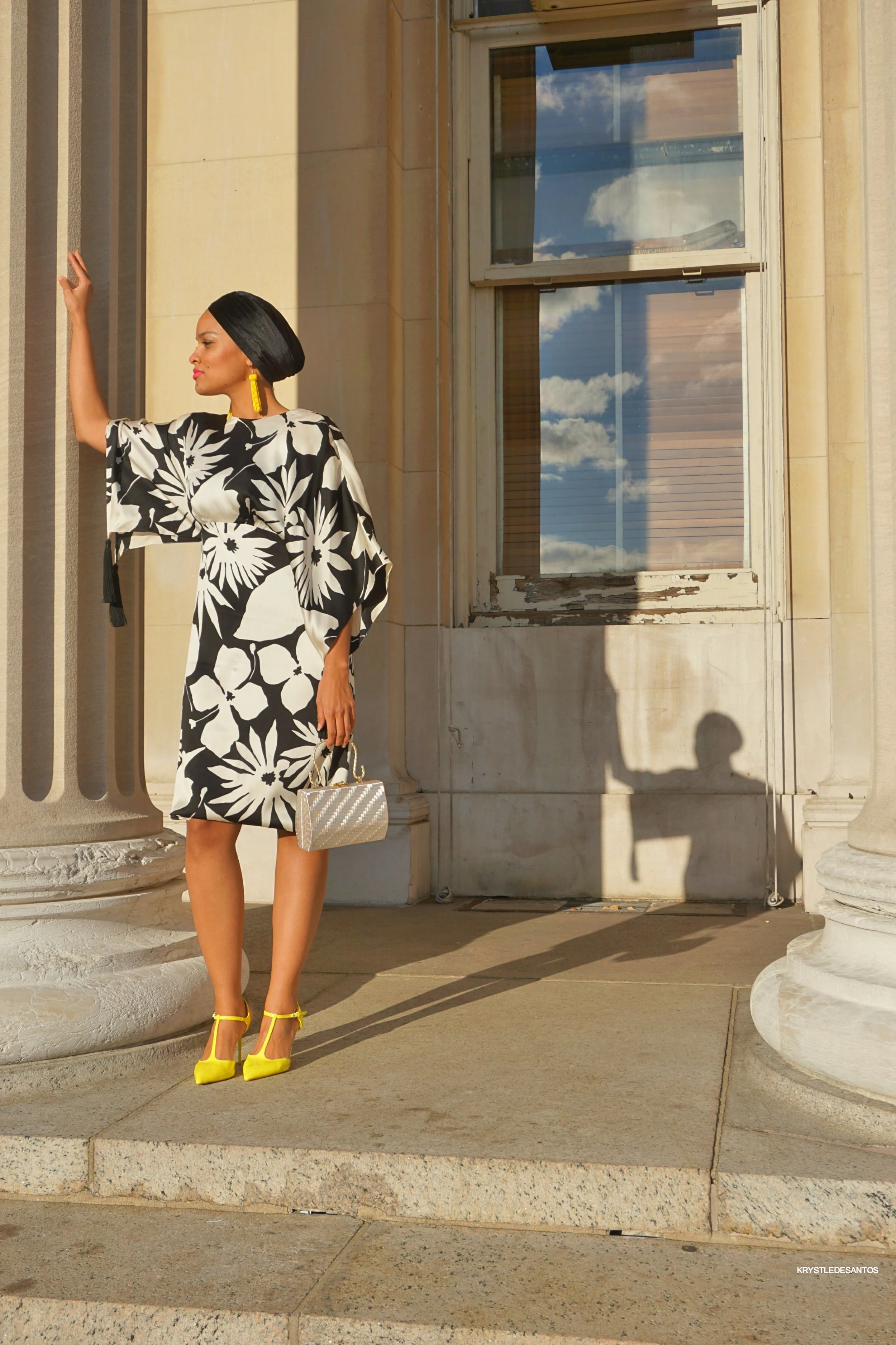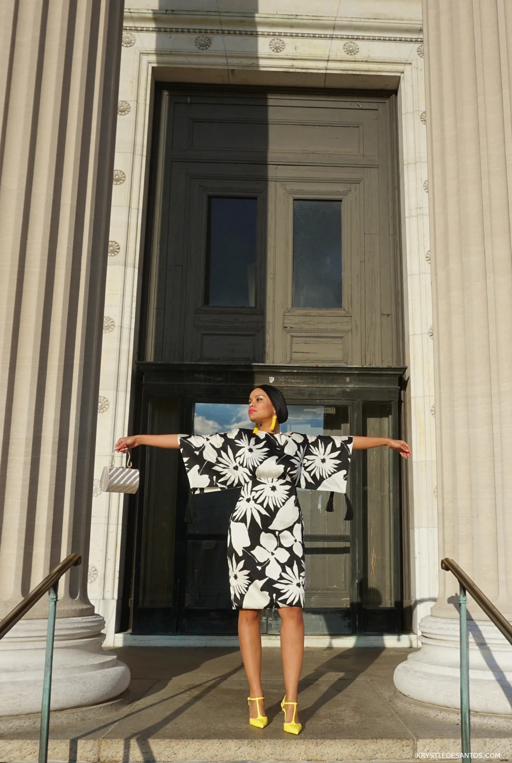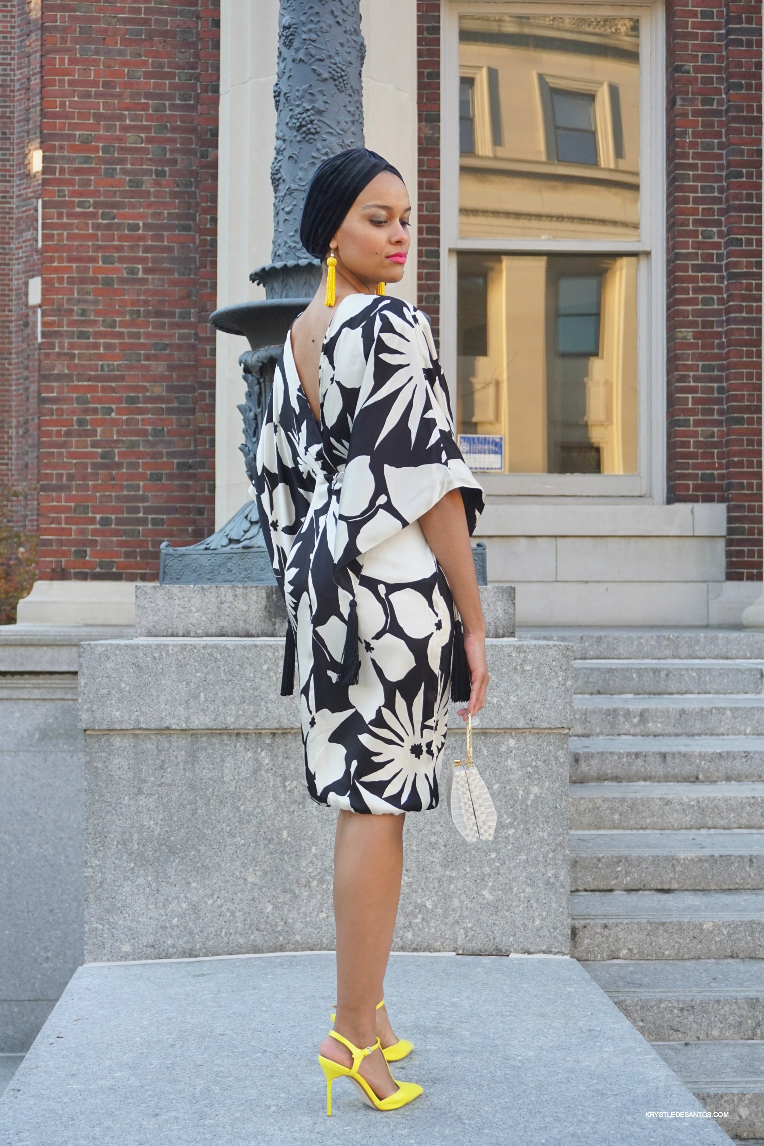 I styled this beautiful black and white floral silk kimino dress with a black velvet turban and yellow beaded tassel earrings for my signature retro-glam look Turbans and Tassels!
