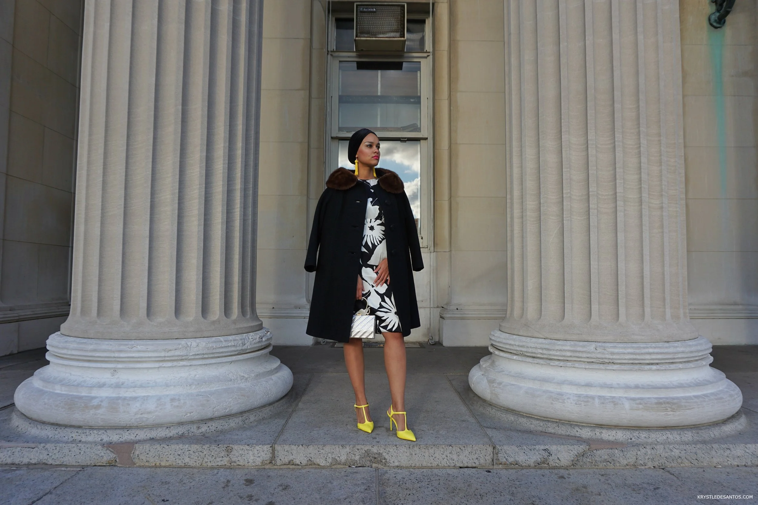 Yellow t-strap heels and a vintage pearlized basketweave purse with gold ornate handles ties the entire look together.