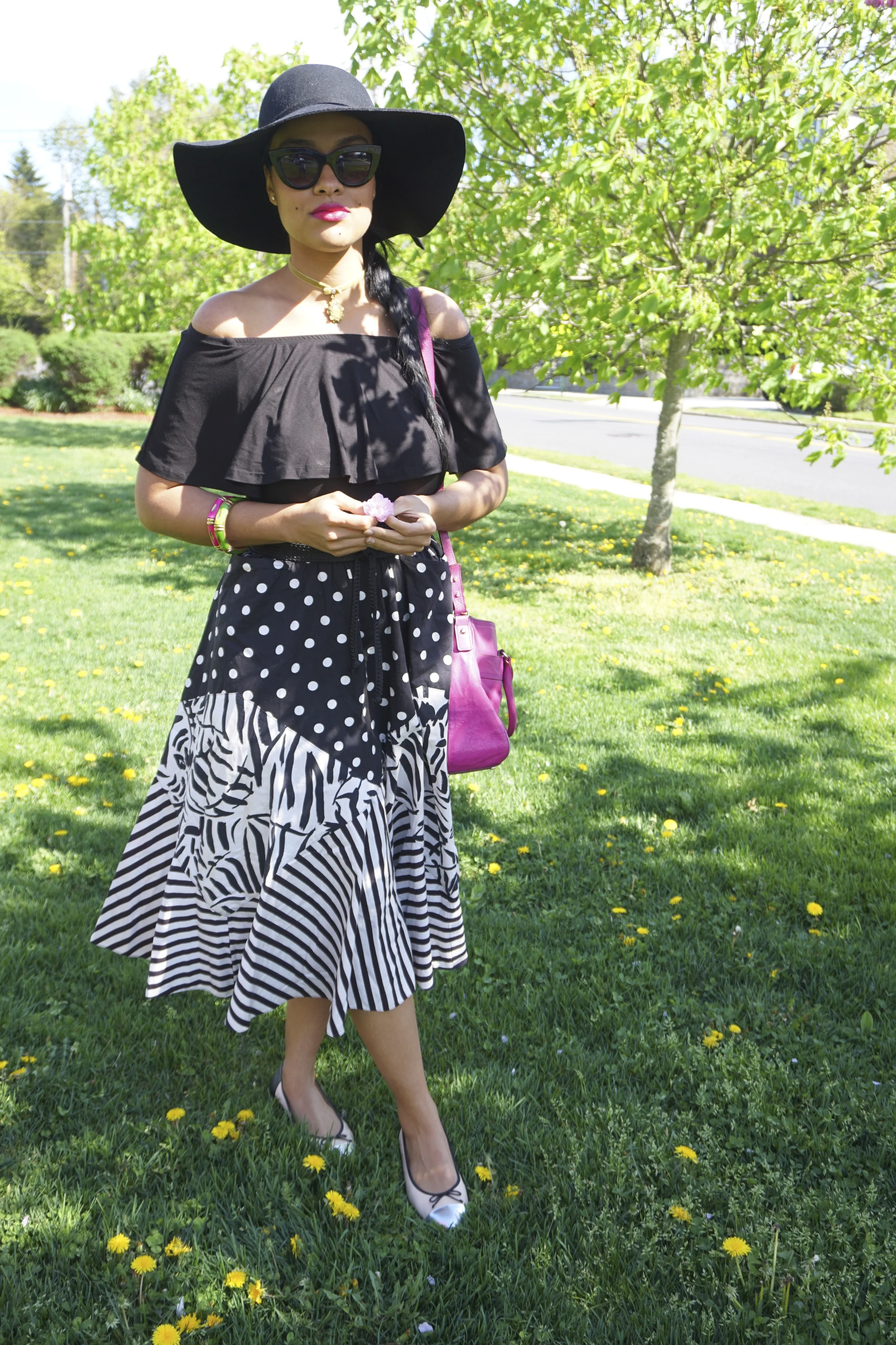 I'm wearing a ruffle off the shoulder body suit, one of my favorite vintage mixed-print skirts from mom, vintage velvet choker with locket, wool floppy hat, cat-eye sunglasses, a vintage cord tie belt and color block flats. I added pops of color with pink lipstick, pink purse and colorful vintage bracelets.