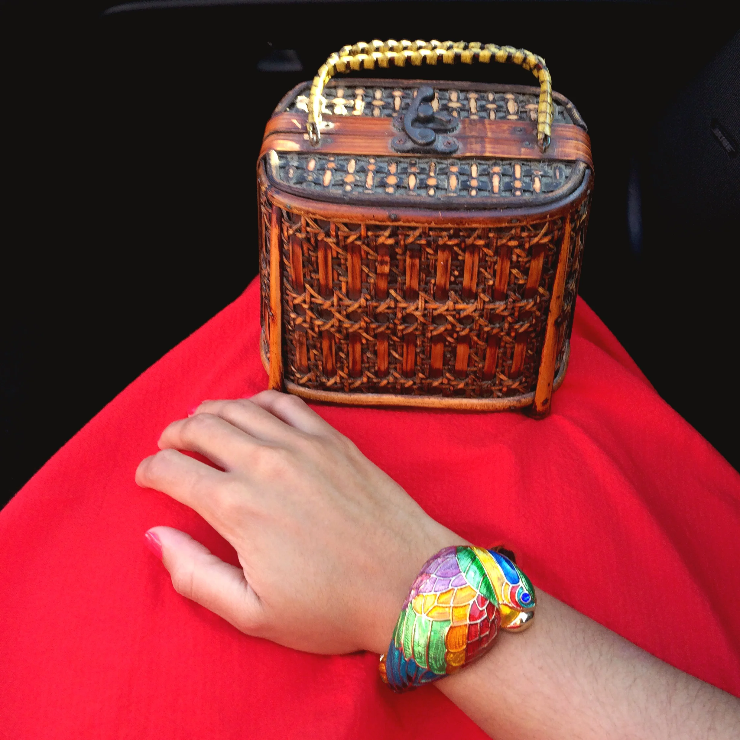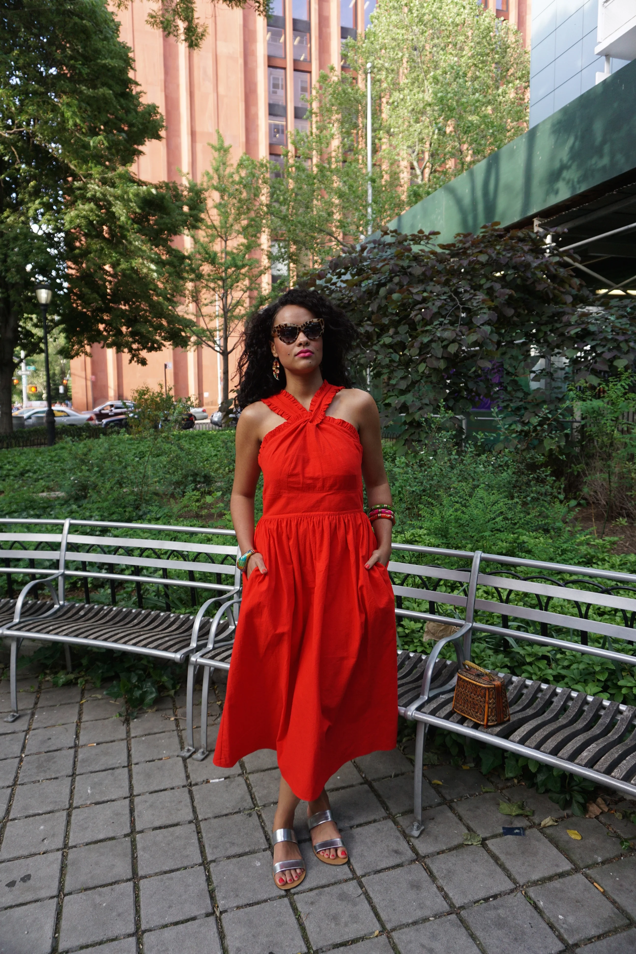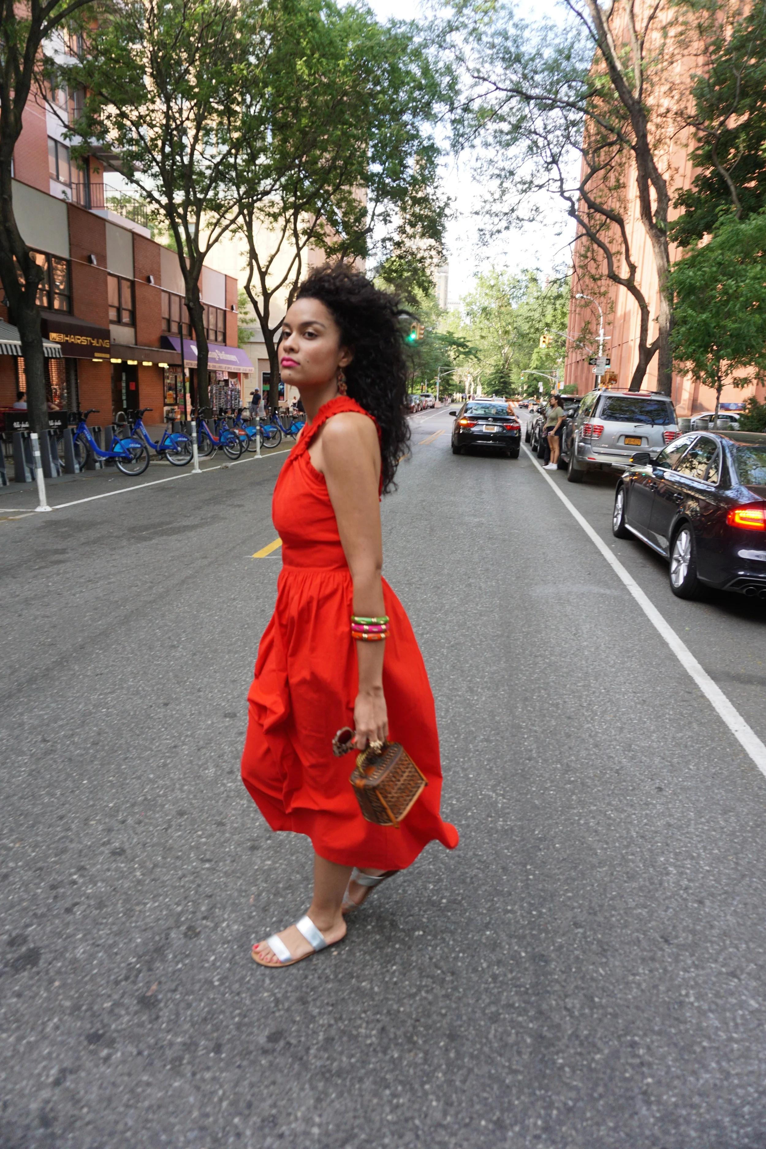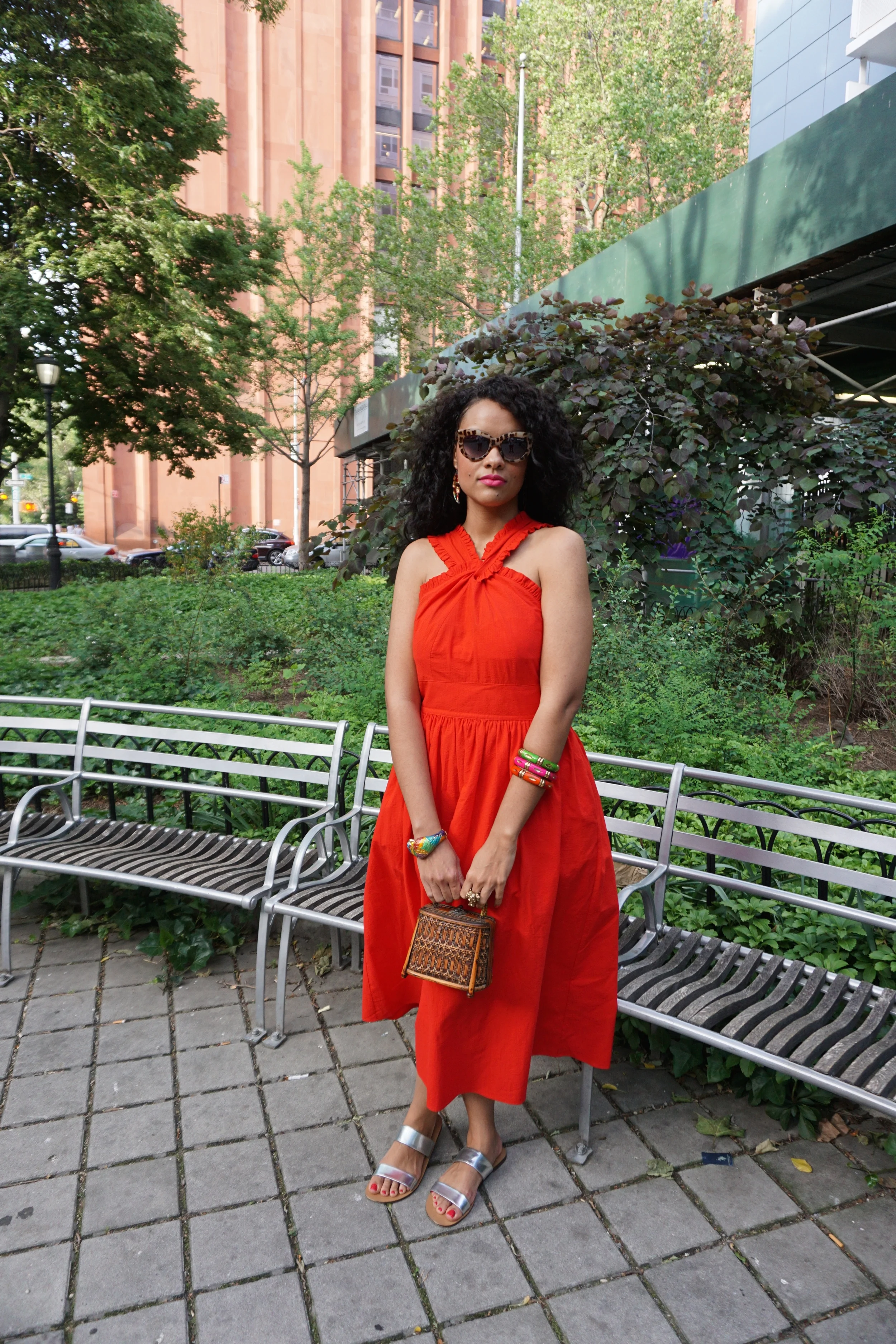 Over the weekend I attended a brunch event and wore a bright red dress that reminds me of the dancing emoji lady. The dress is calf length and made out of cotton that has a similar texture to seersucker. The shoulder straps criss-cross in the front and have tiny ruffle details. I wanted to go for a laid back look so I styled the dress with flat silver slides, a stack of colorful vintage bangles, a parrot hinge bracelet (a gift from my sister), gold frog ring, mom's tropical leaf earrings and a woven wooden hinge purse that I purchased about 10 years ago. I love bright colors and wanted to do a bit of "color-blocking" so I opted for pink lips and nails instead of red.