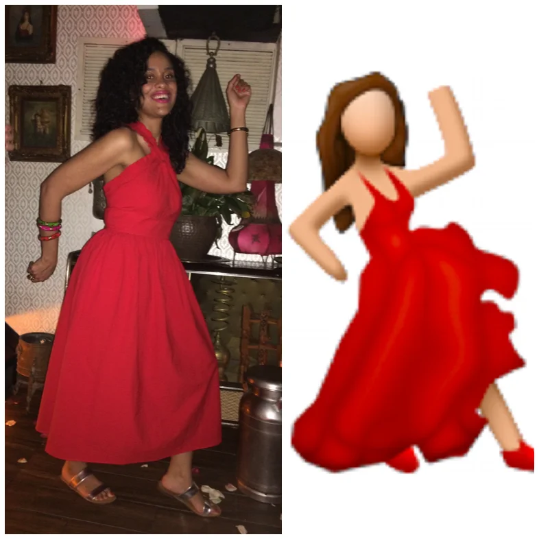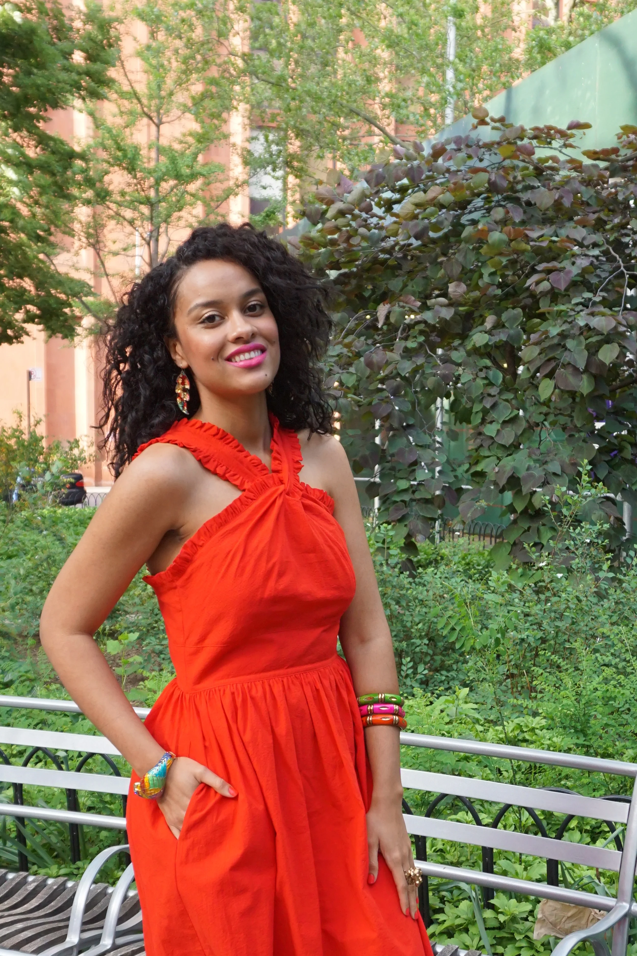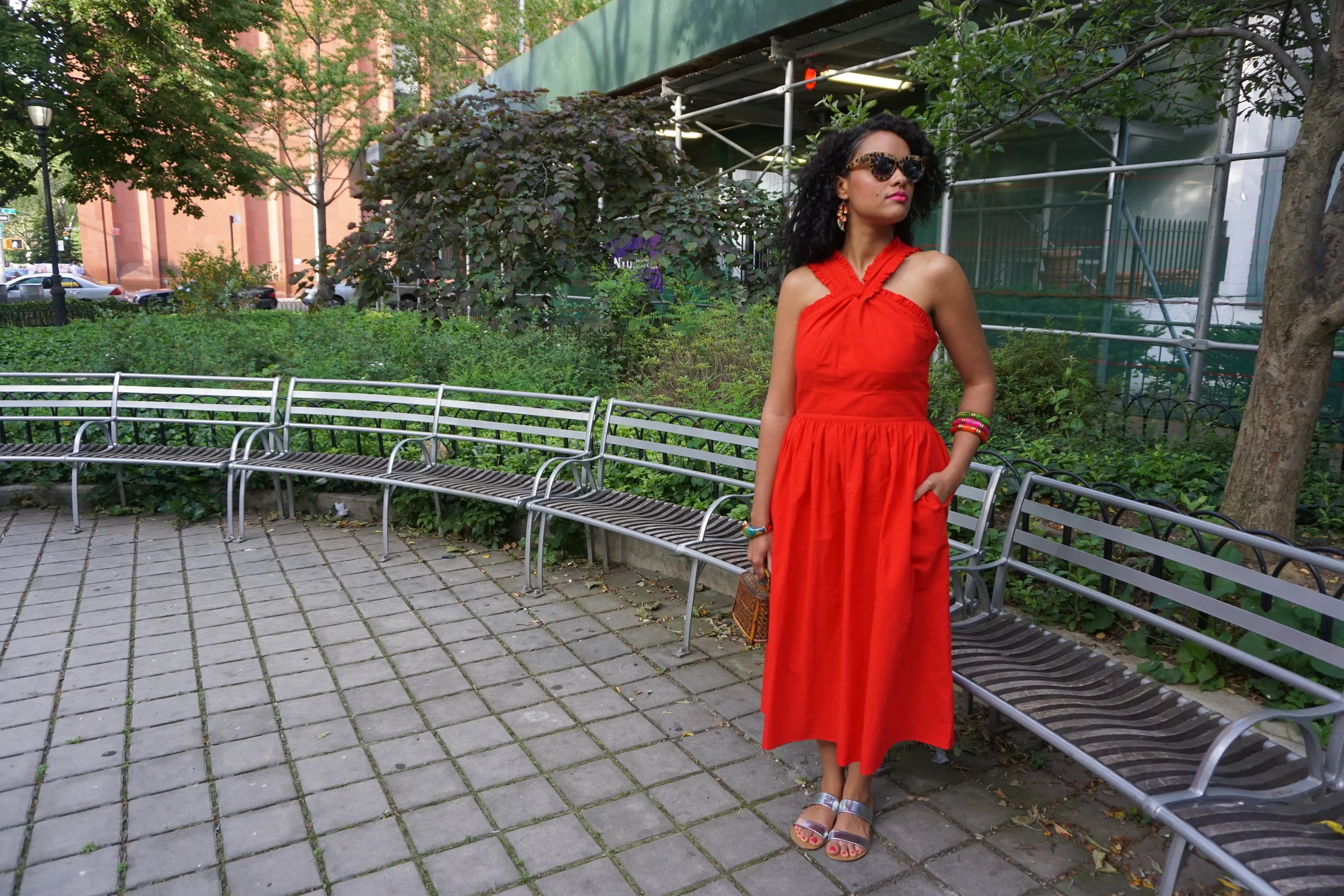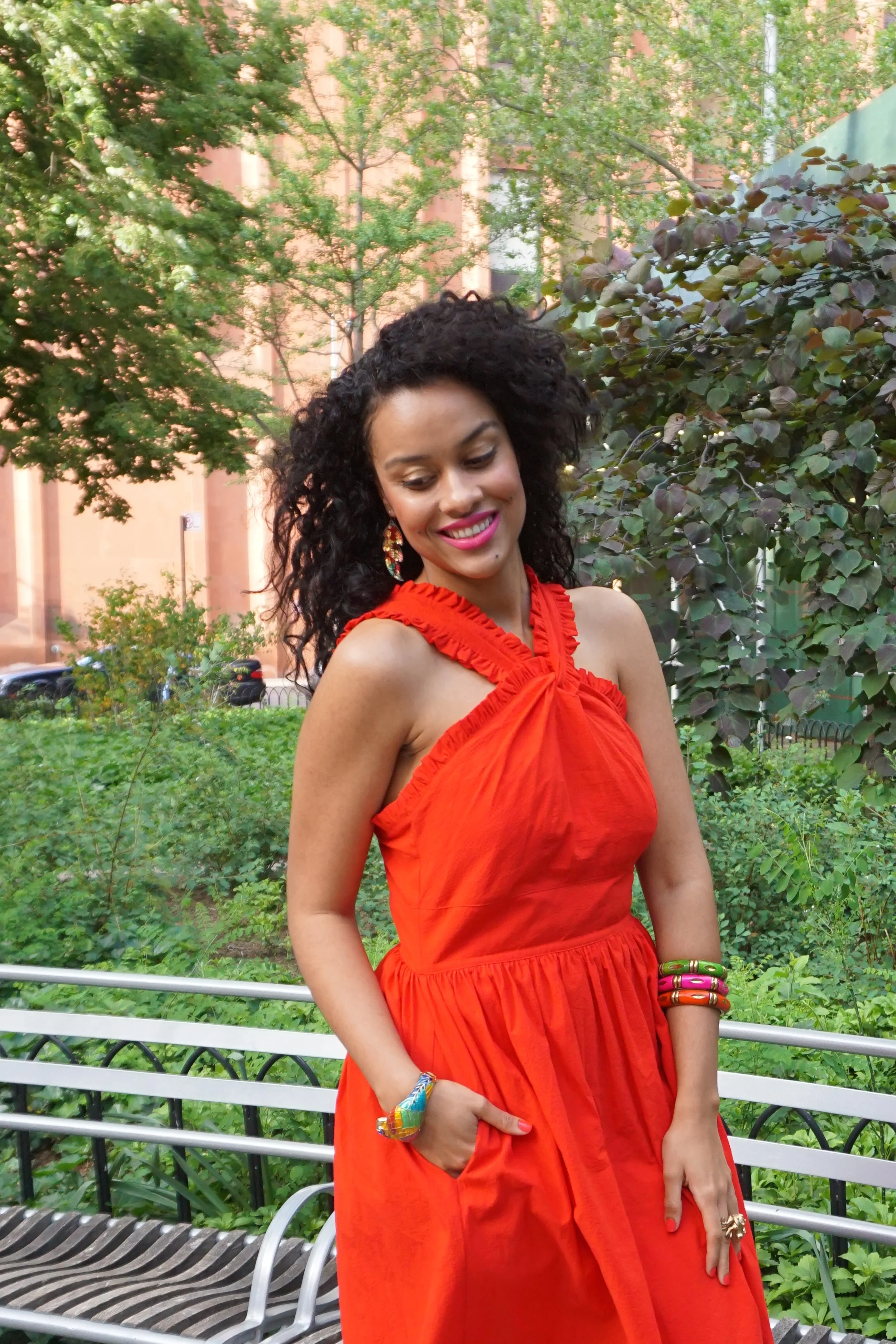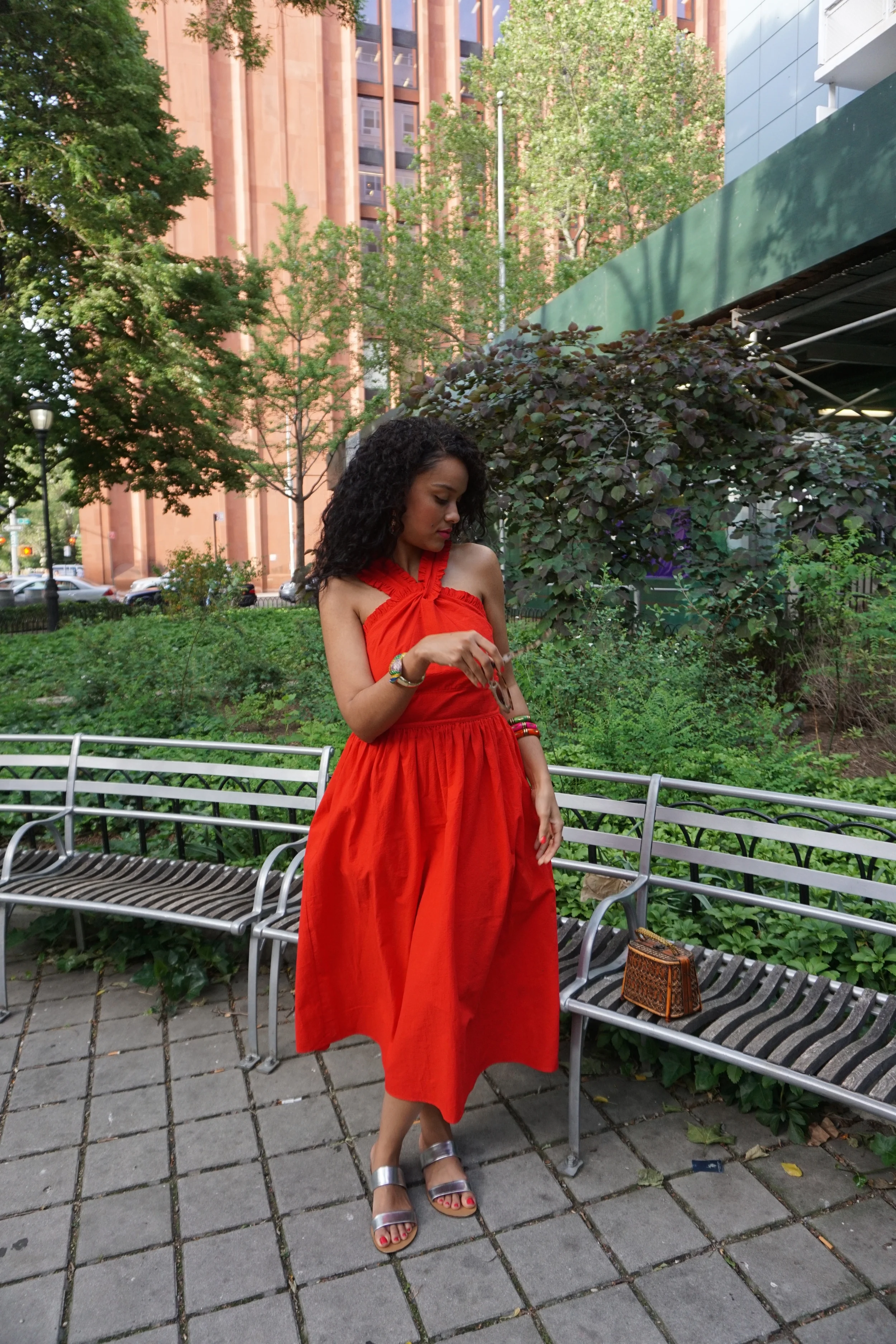 Over the weekend I attended a brunch event and wore a bright red dress that reminds me of the dancing emoji lady. The dress is calf length and made out of cotton that has a similar texture to seersucker. The shoulder straps criss-cross in the front and have tiny ruffle details. I wanted to go for a laid back look so I styled the dress with flat silver slides, a stack of colorful vintage bangles, a parrot hinge bracelet (a gift from my sister), gold frog ring, mom's tropical leaf earrings and a woven wooden hinge purse that I purchased about 10 years ago. I love bright colors and wanted to do a bit of "color-blocking" so I opted for pink lips and nails instead of red.