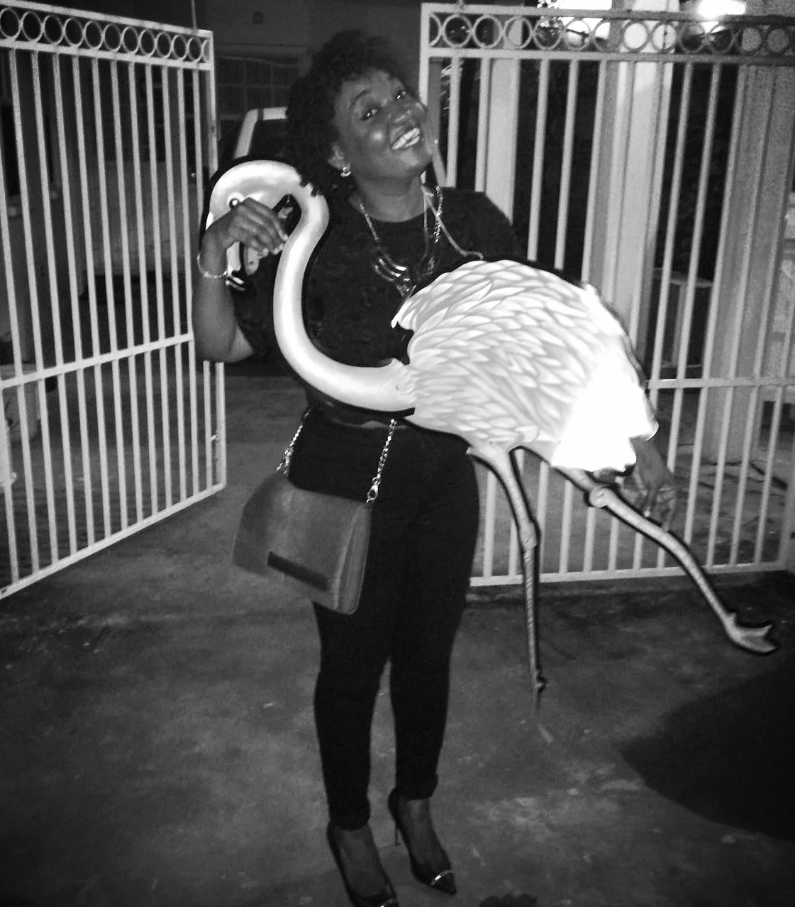 Here she is sneaking out the party (after a couple cocktails) with flamingo in hand. Thanks Tiny Tim!