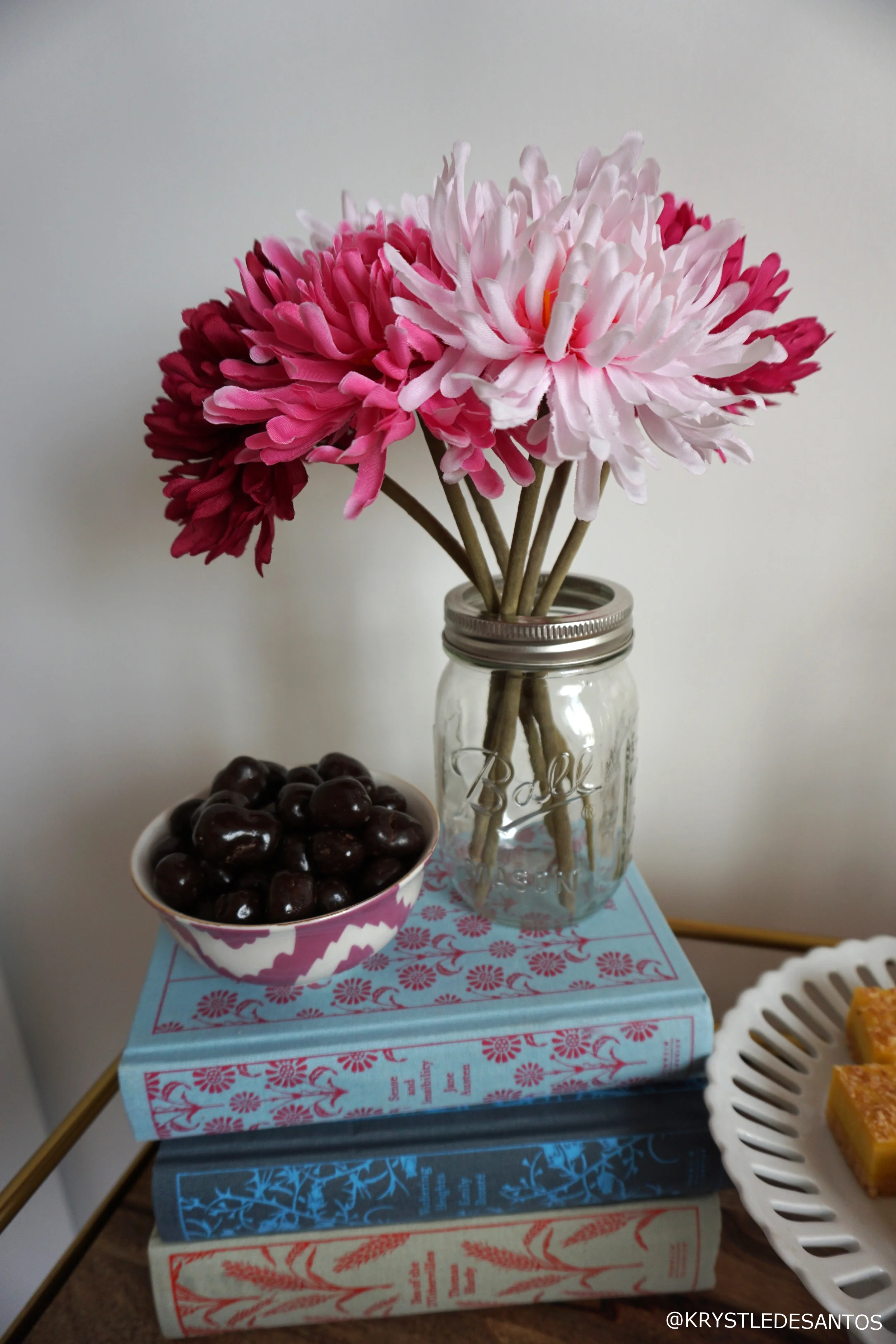 The faux chrysanthemums look a bit similar to peonies when they're in full bloom and are a recent purchase from IKEA. You can find them in store or online. I trimmed their long stems, put them in a mason jar and placed them on top a stack of pretty hardcover books.