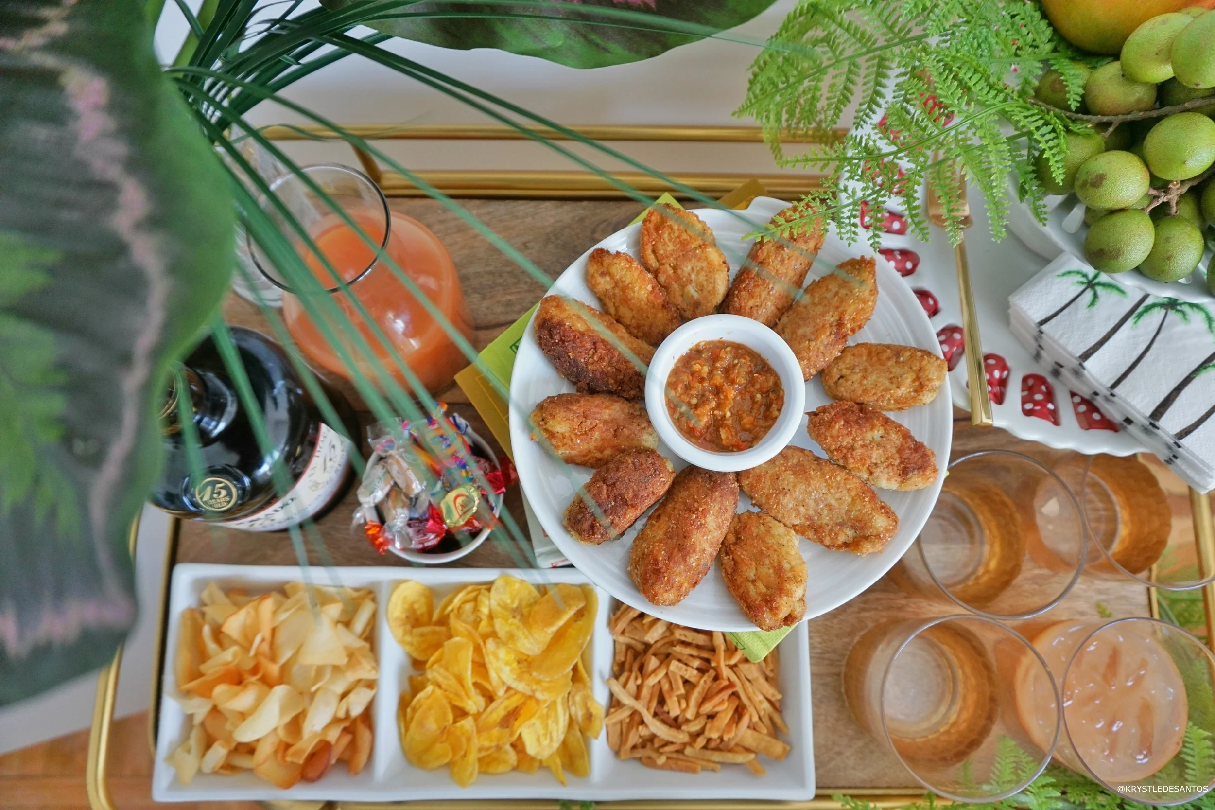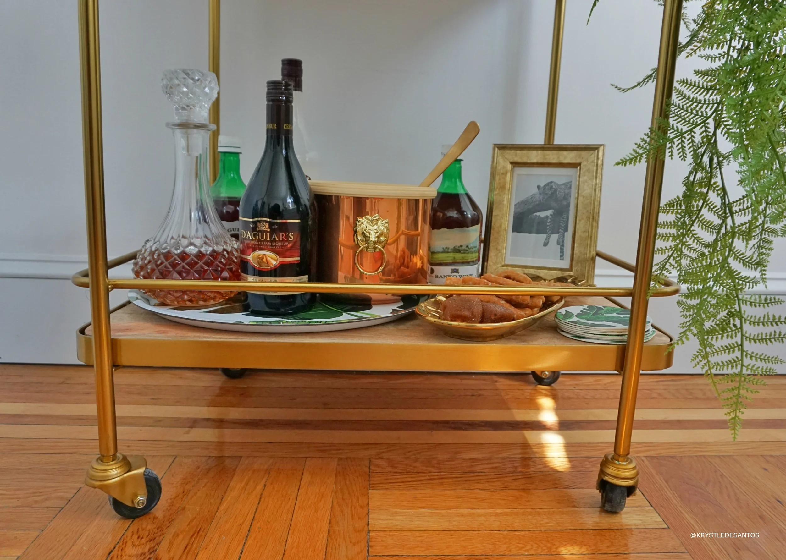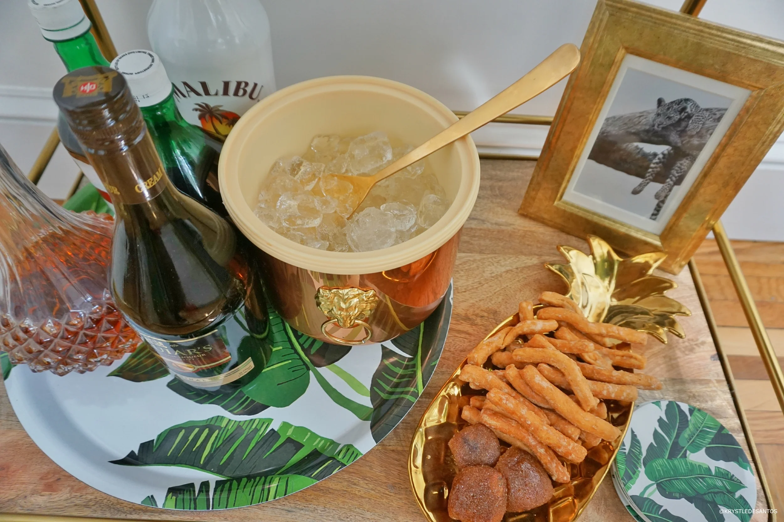 Let's also take a moment to admire this beautiful vintage copper ice-bucket with gold lion knobs! I linked to the exact vintage version in the widget, so you can get one as well! Jaguars are found in Guyana and I thought my famed photo fit nicely into the decor of the cart. The golden pineapple dish was also a great find at H&M home and I added Mithai and tamarind balls for a sweet and sour treat!