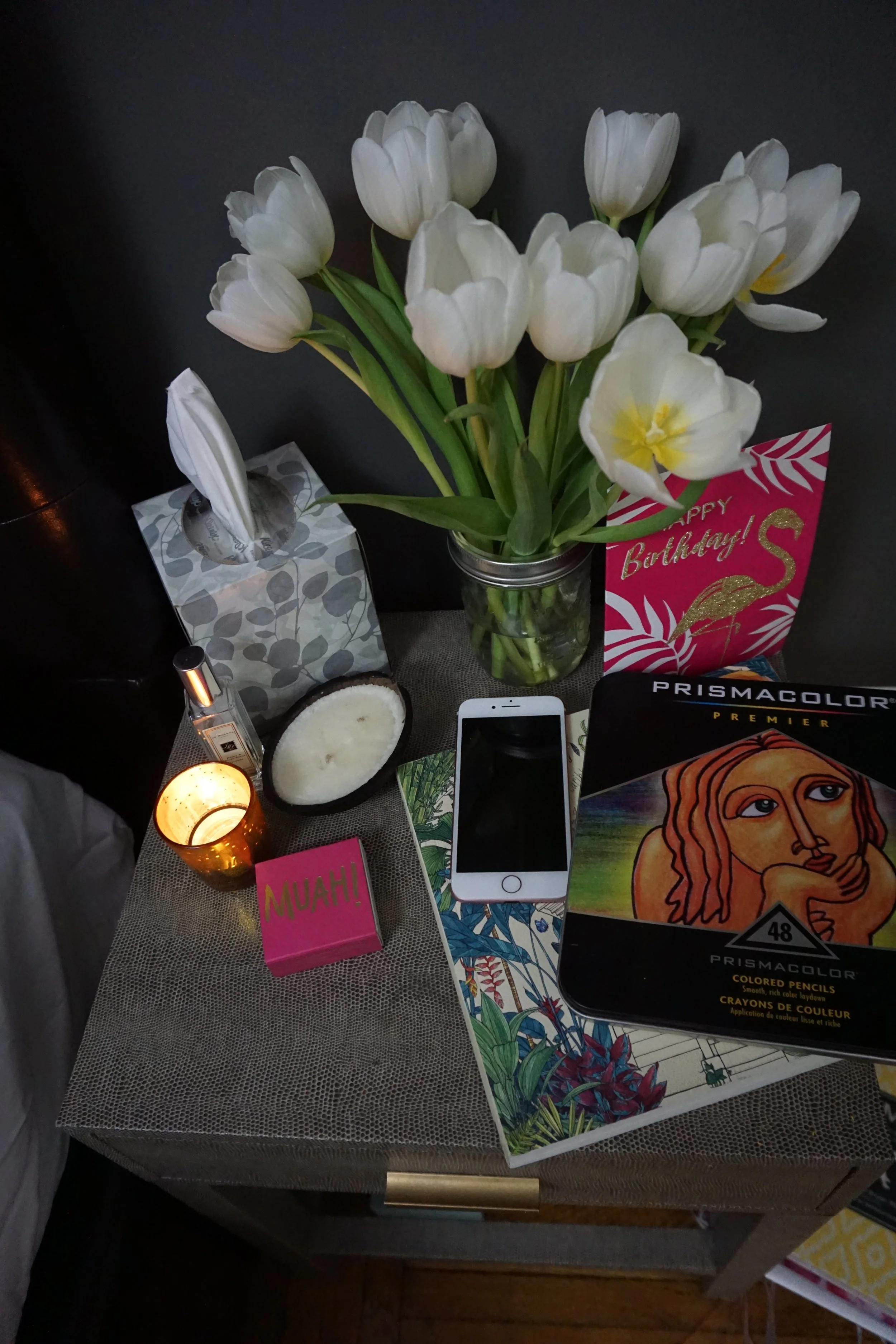 My friend from work gifted me a bunch of pretty white tulips. I brought them home and placed on my side table near the bed! Thanks Kim!