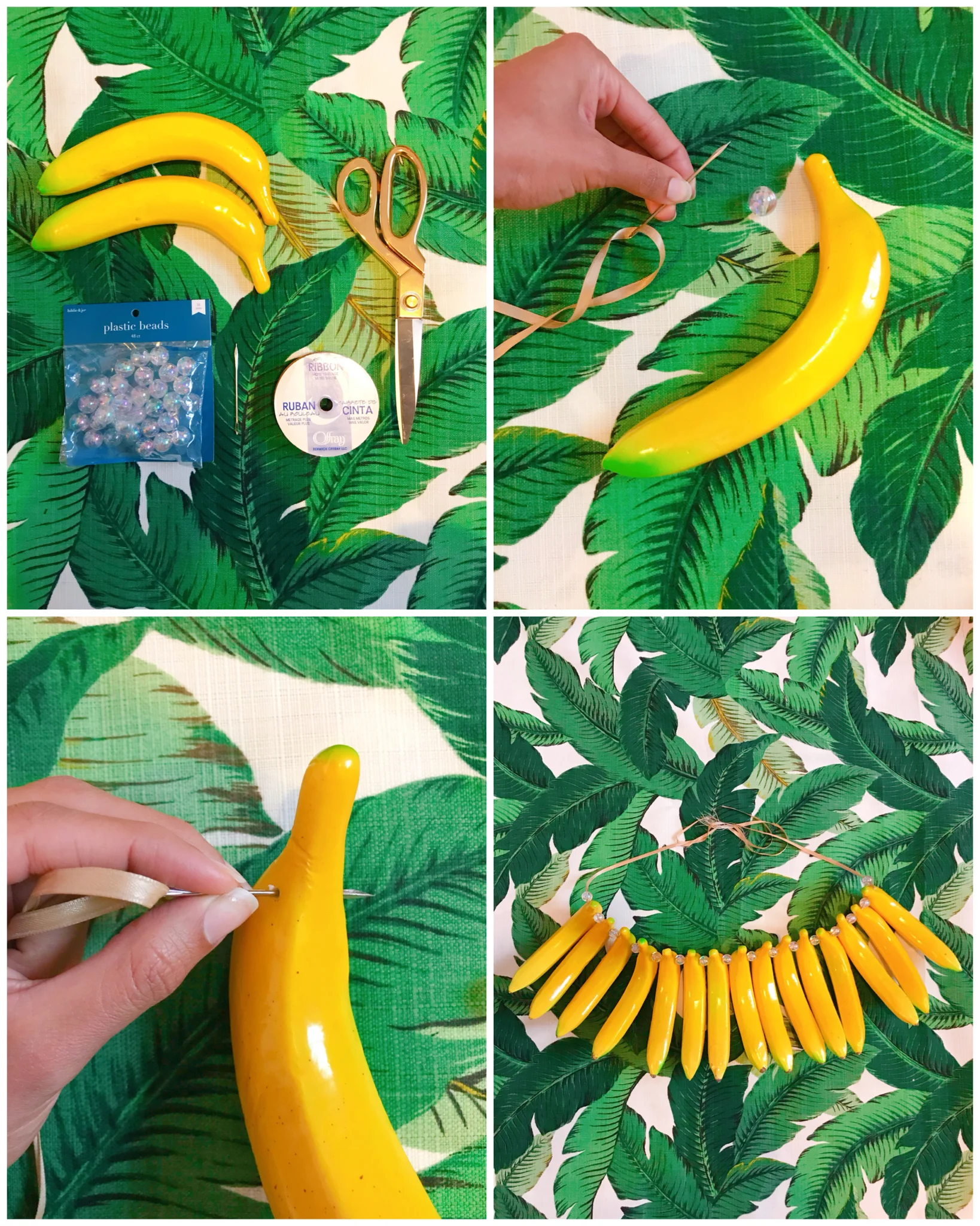 To make the banana skirt, thread your needle with your ribbon and string a banana followed by a bead onto the ribbon.Repeat this until you have a banana skirt to cover at least the front of your body. I opted for a half skirt but you can take the bananas all the way around ensuring you have some ribbon left to tie in the back.