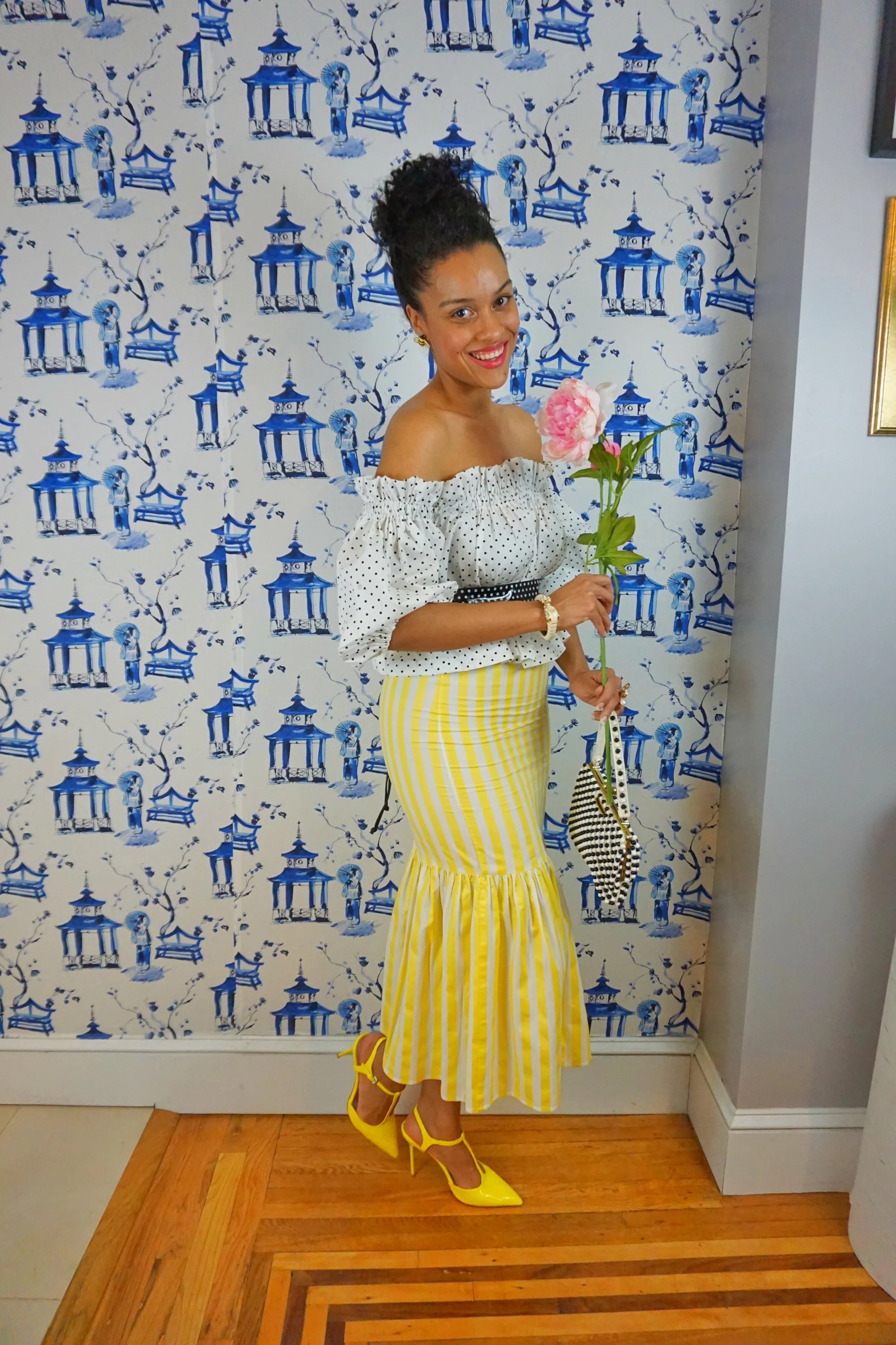 The inspiration for this look actually came from a simple pair of Bumble Bee earrings I got at Target years ago. From there I played off the Bee's striped pattern, wearing a yellow & white striped vintage skirt with yellow t-strap heels. I wanted to do a bit of pattern mixing so I added my off the shoulder polkadot top & vintage contrasting polkadot belt from Mom. Heart sunnies as my Bee eyes, a vintage beaded purse and pearl flower ring tied the look together.