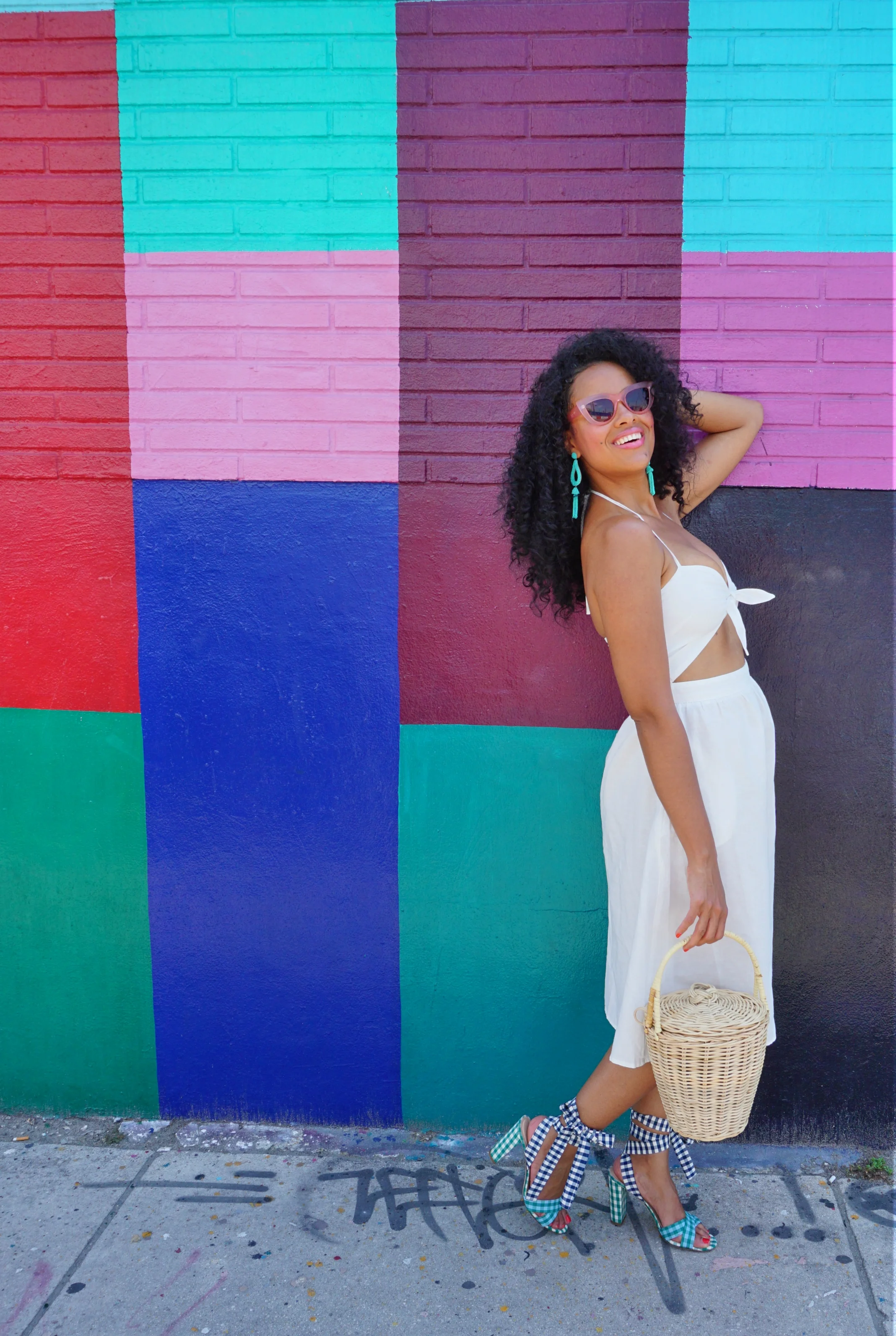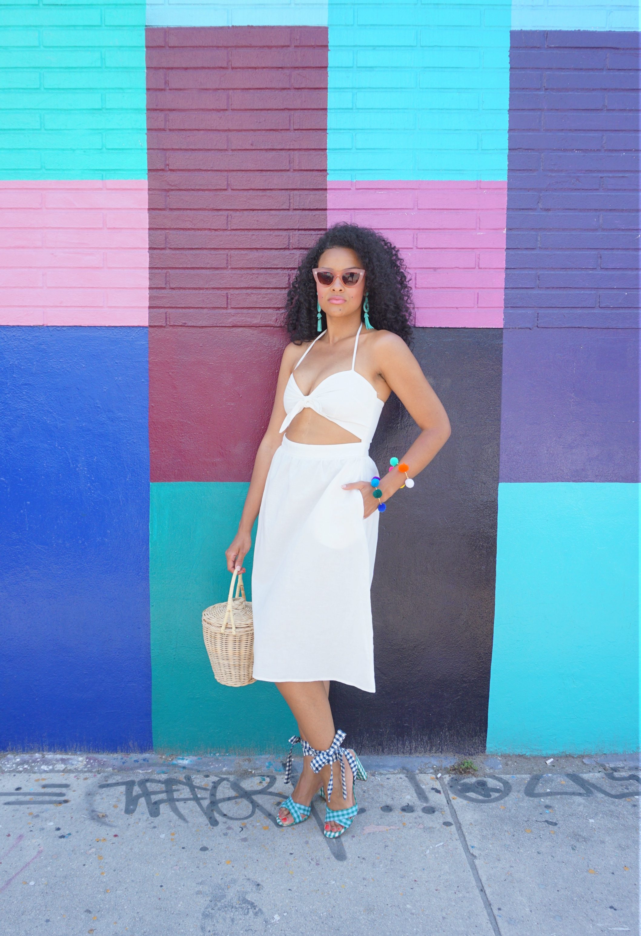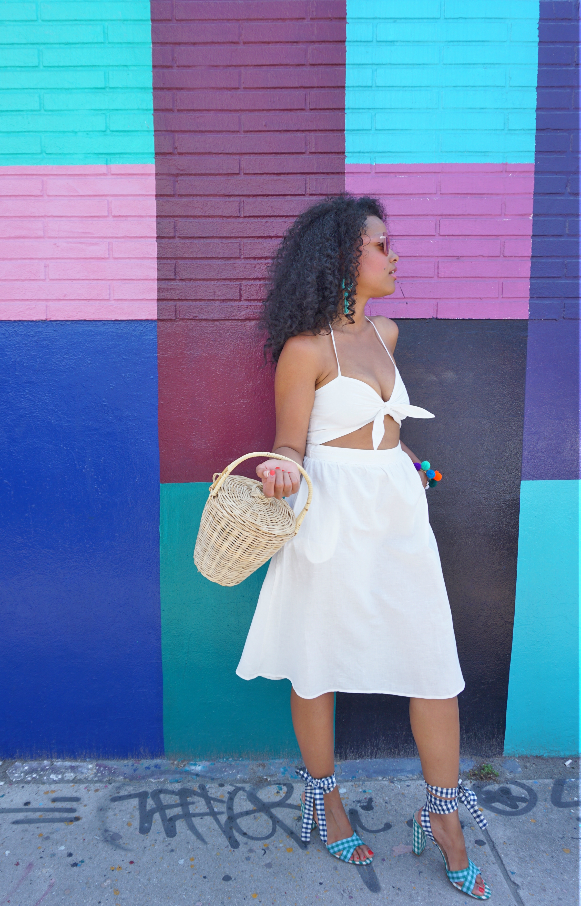 I styled it with pom pom bracelets (more details to come on those soon), beaded teardrop tassel earrings, wicker bucket purse, gingham ankle strap heels and cat-eye sunglasses in frosted pink for major retro-vibes.