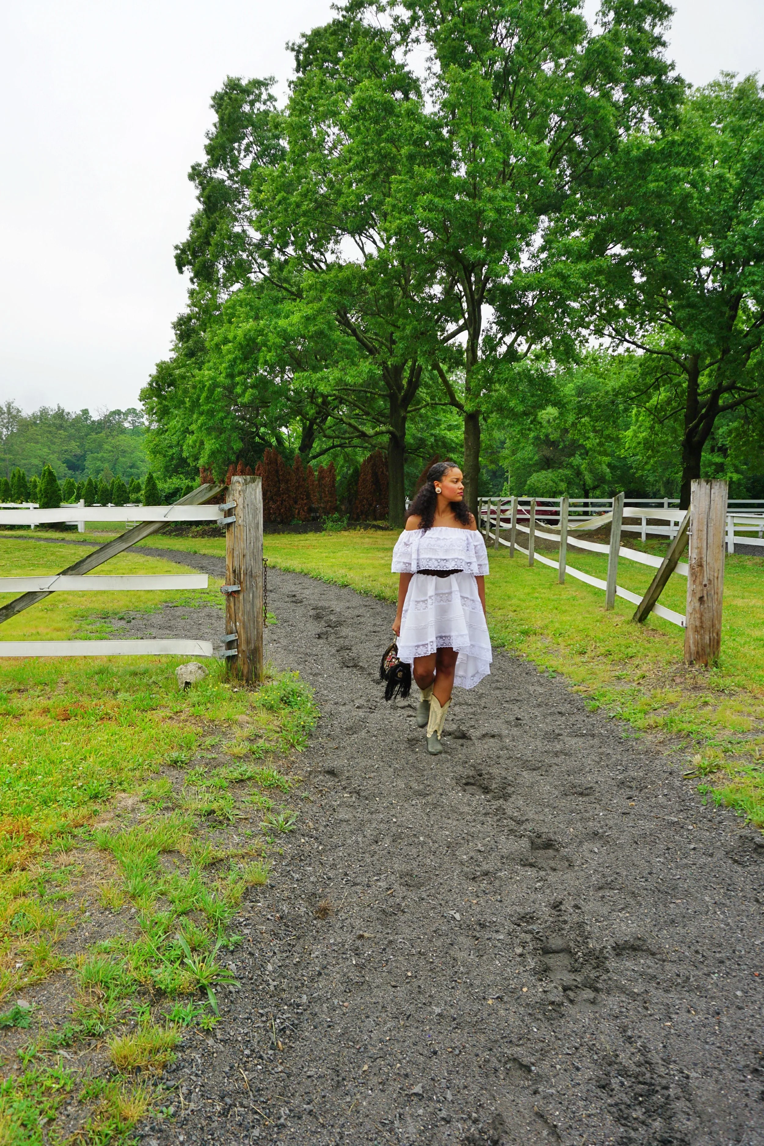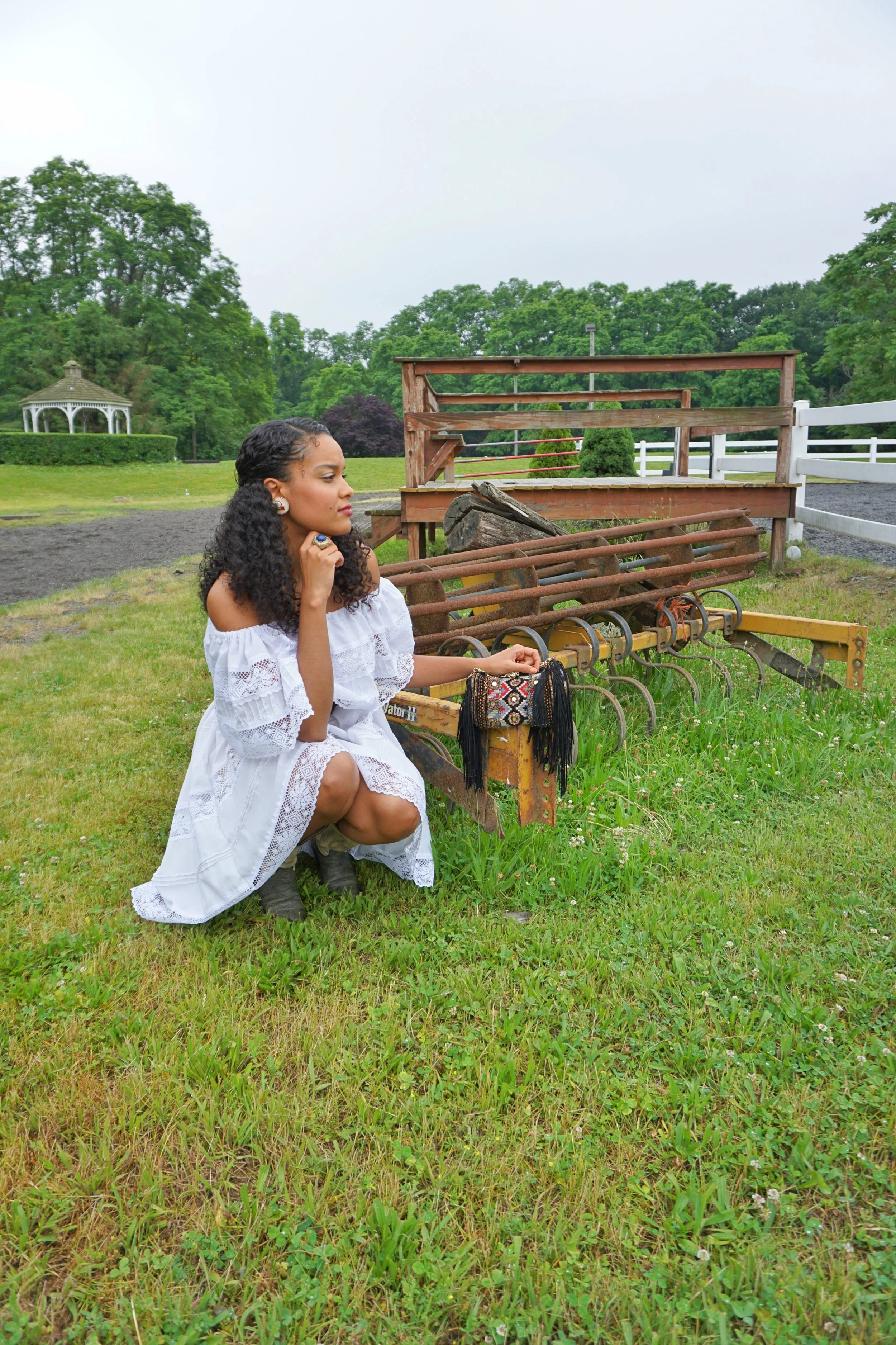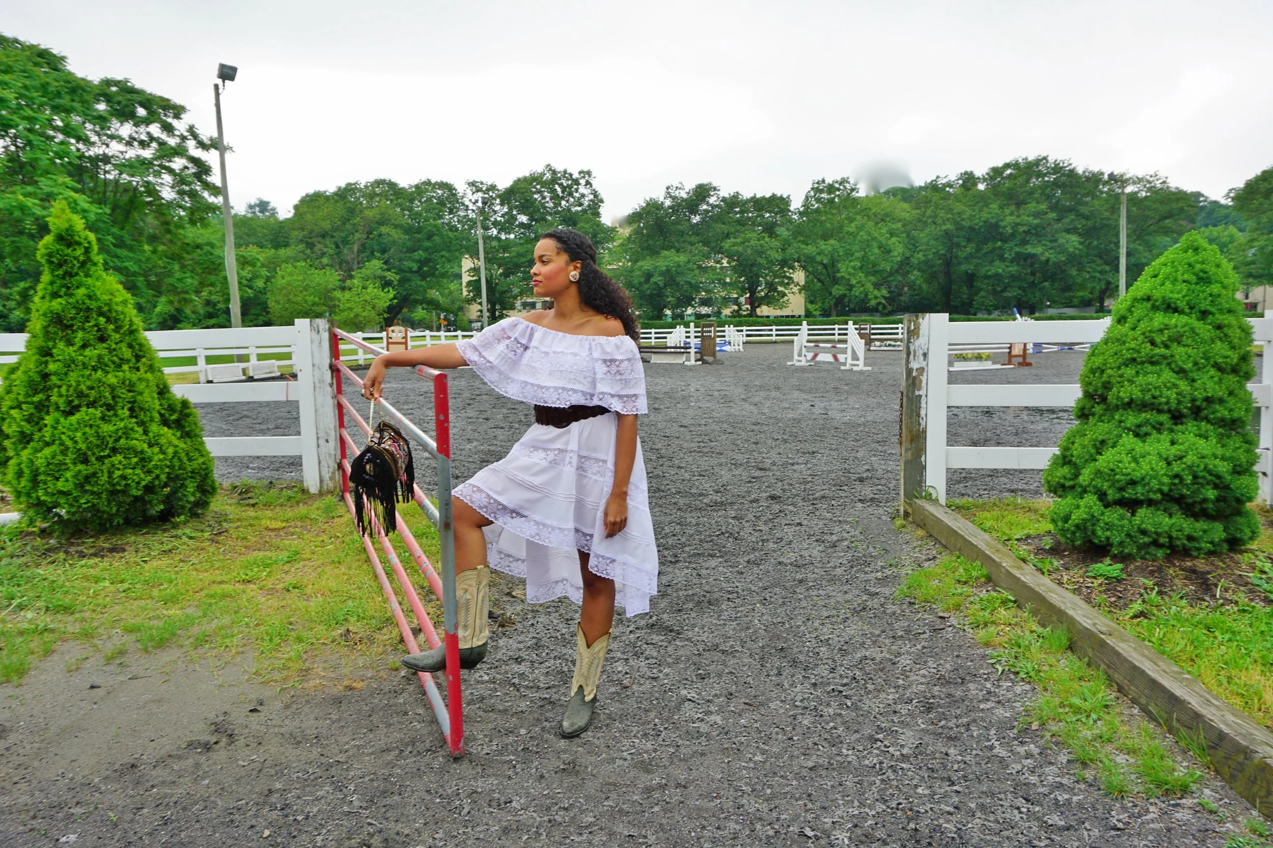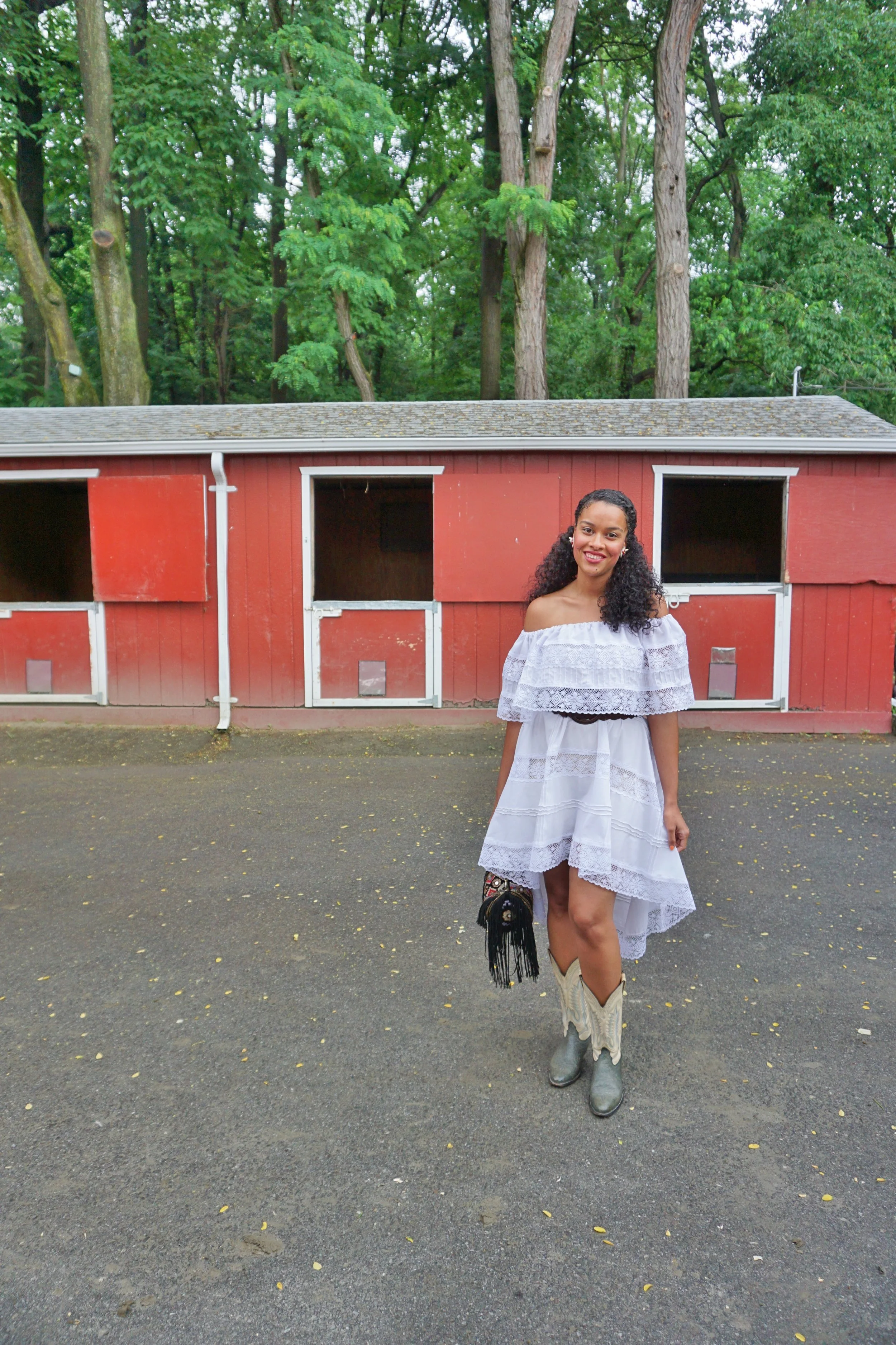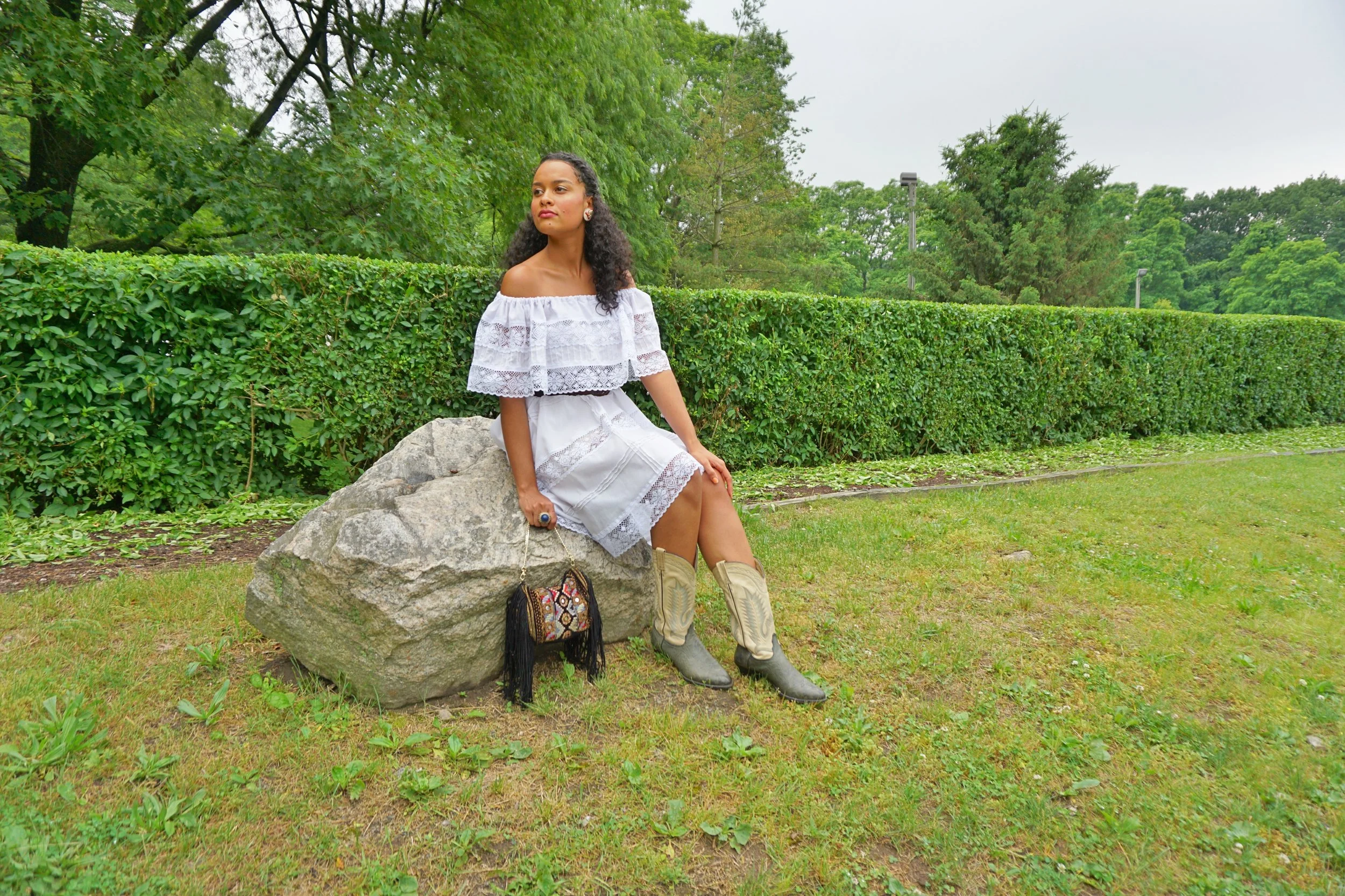 For this look, I wore a white off the shoulder dress that's actually a vintage Mexican wedding dress. I cinched the waist with a broad braided brown belt (picked up from the Philly AIDS Thrift) and tucked the front of my dress under it to create a high-low effect. I wanted to show off my cowgirl boots!