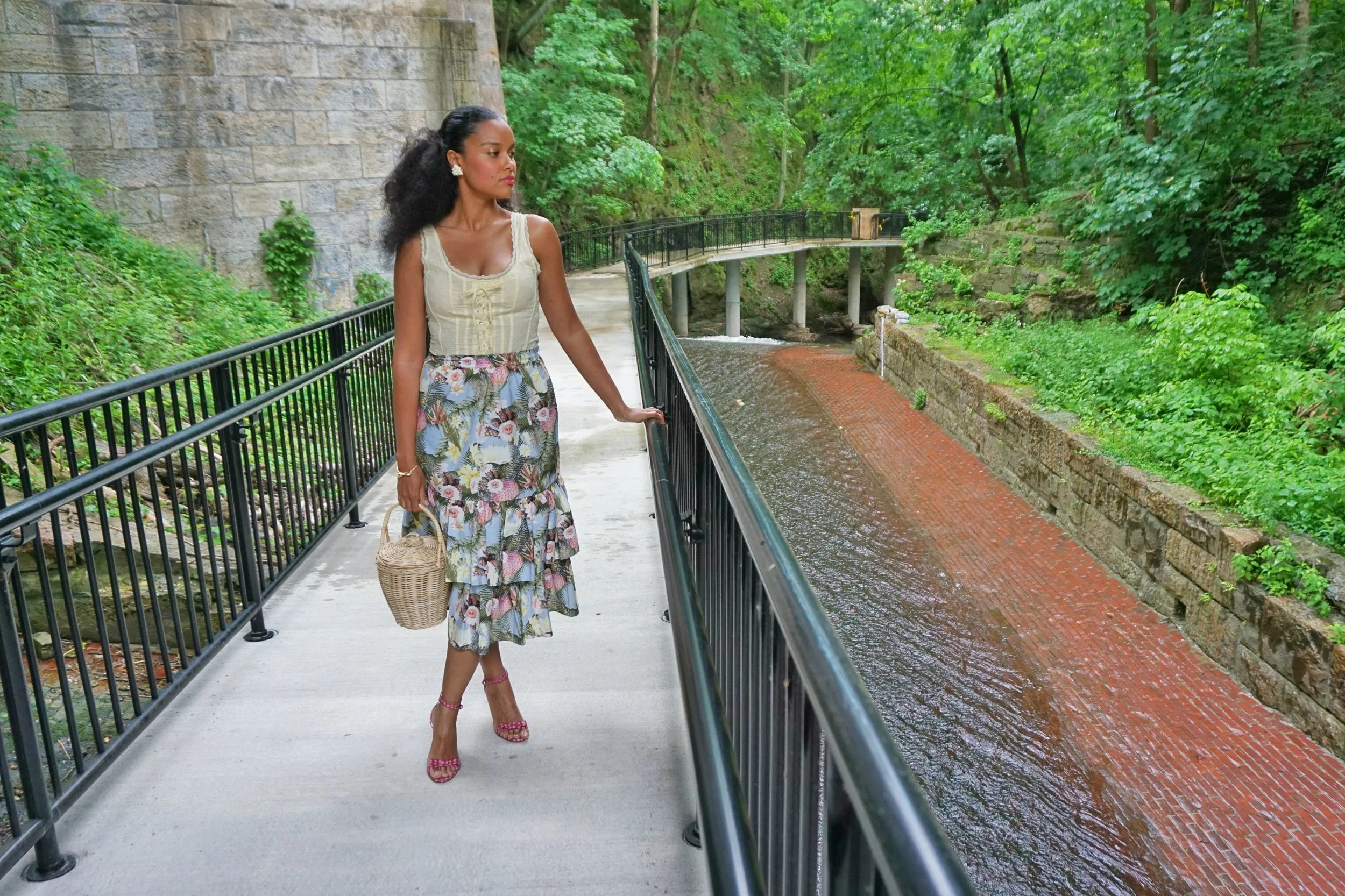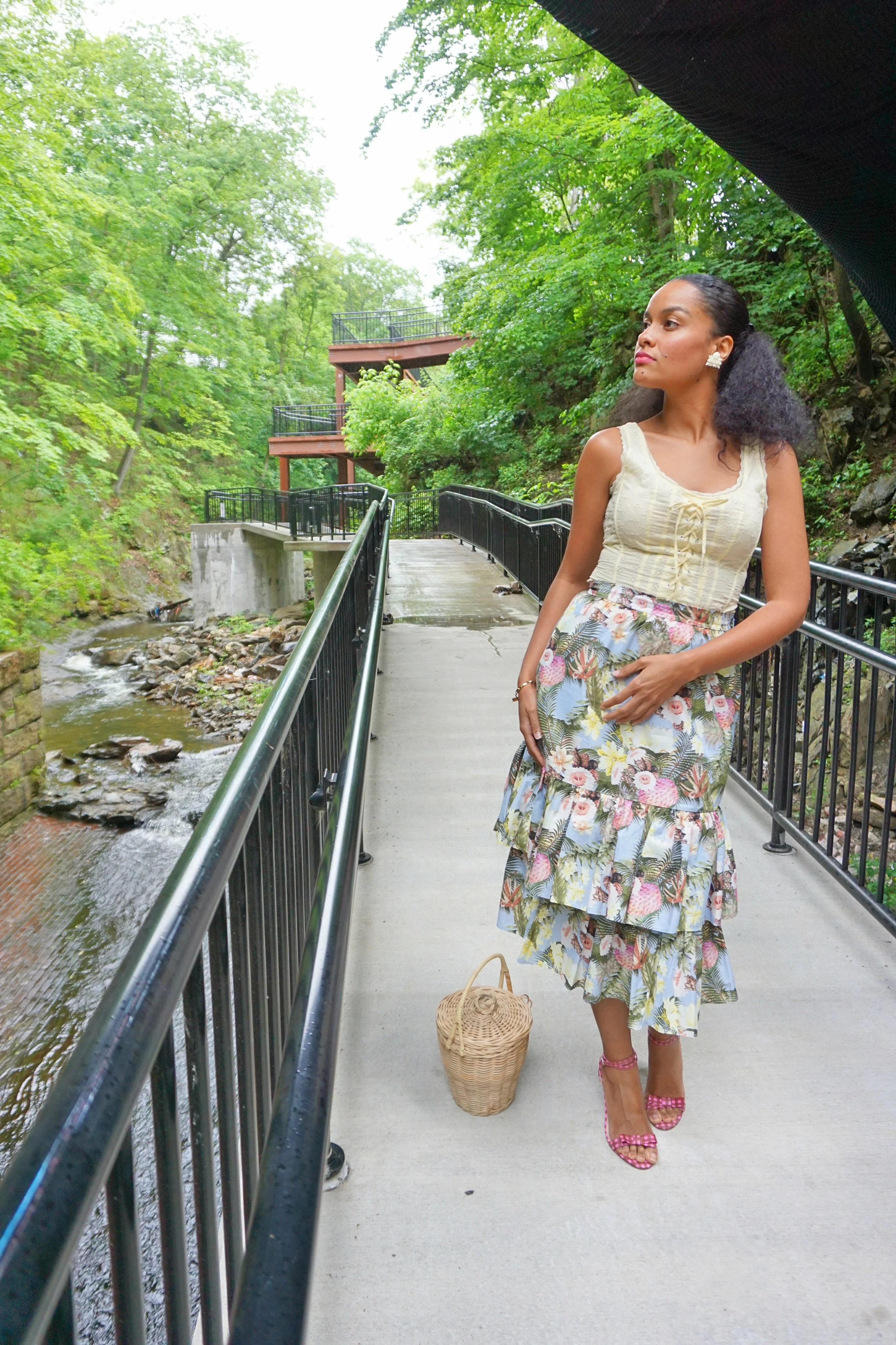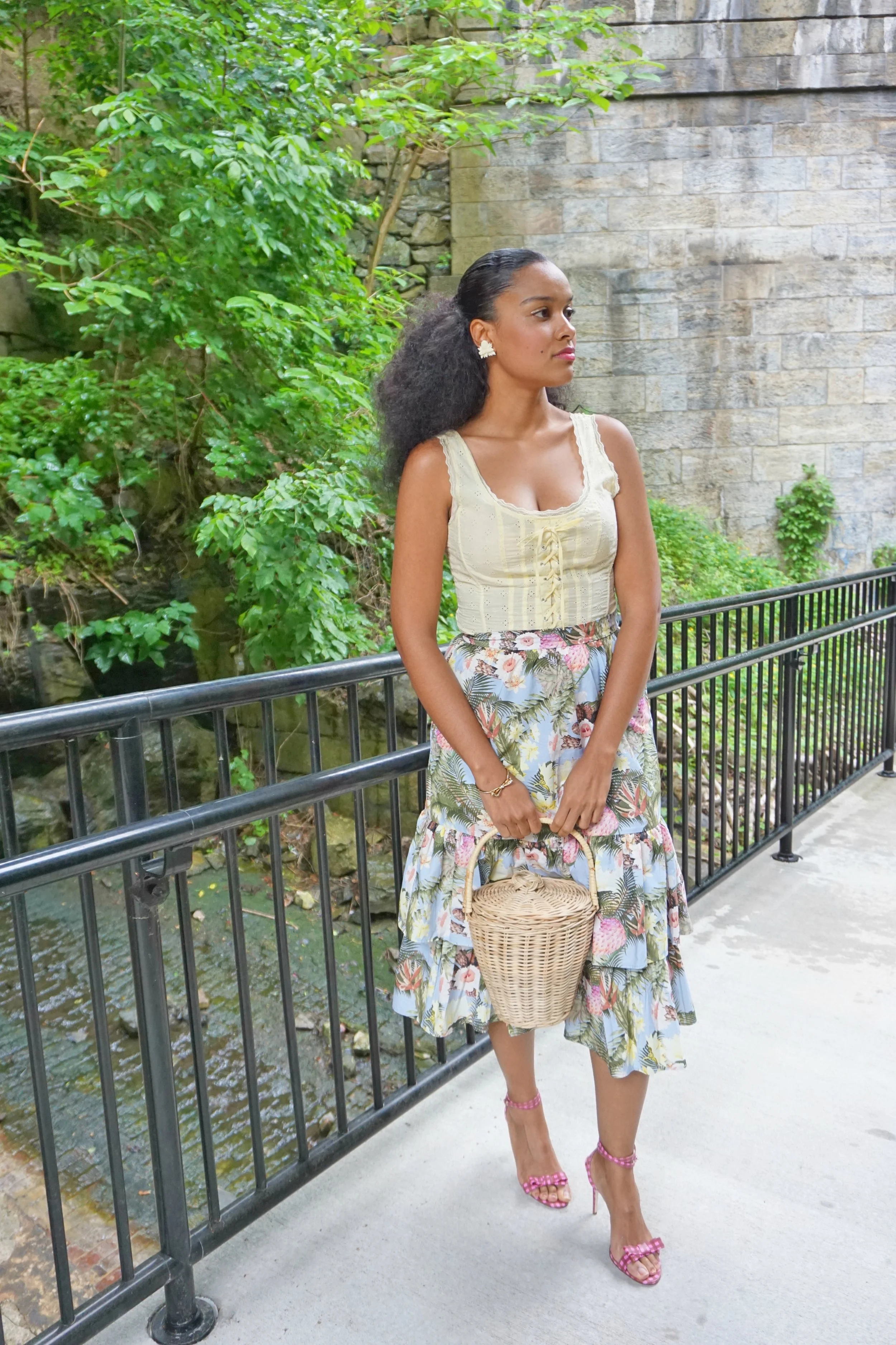 TIERED COTTON SKIRT | WRAP DRESS / JACKET IN THE SAME TROPICAL PRINT | ANGLAISE TOP IN PALE YELLOW & WHITE | SIMILAR PINEAPPLE EARRINGS 1, 2, 3 | SIMILAR HEELS 1, 2, 3 | BASKET BAG 1, 2