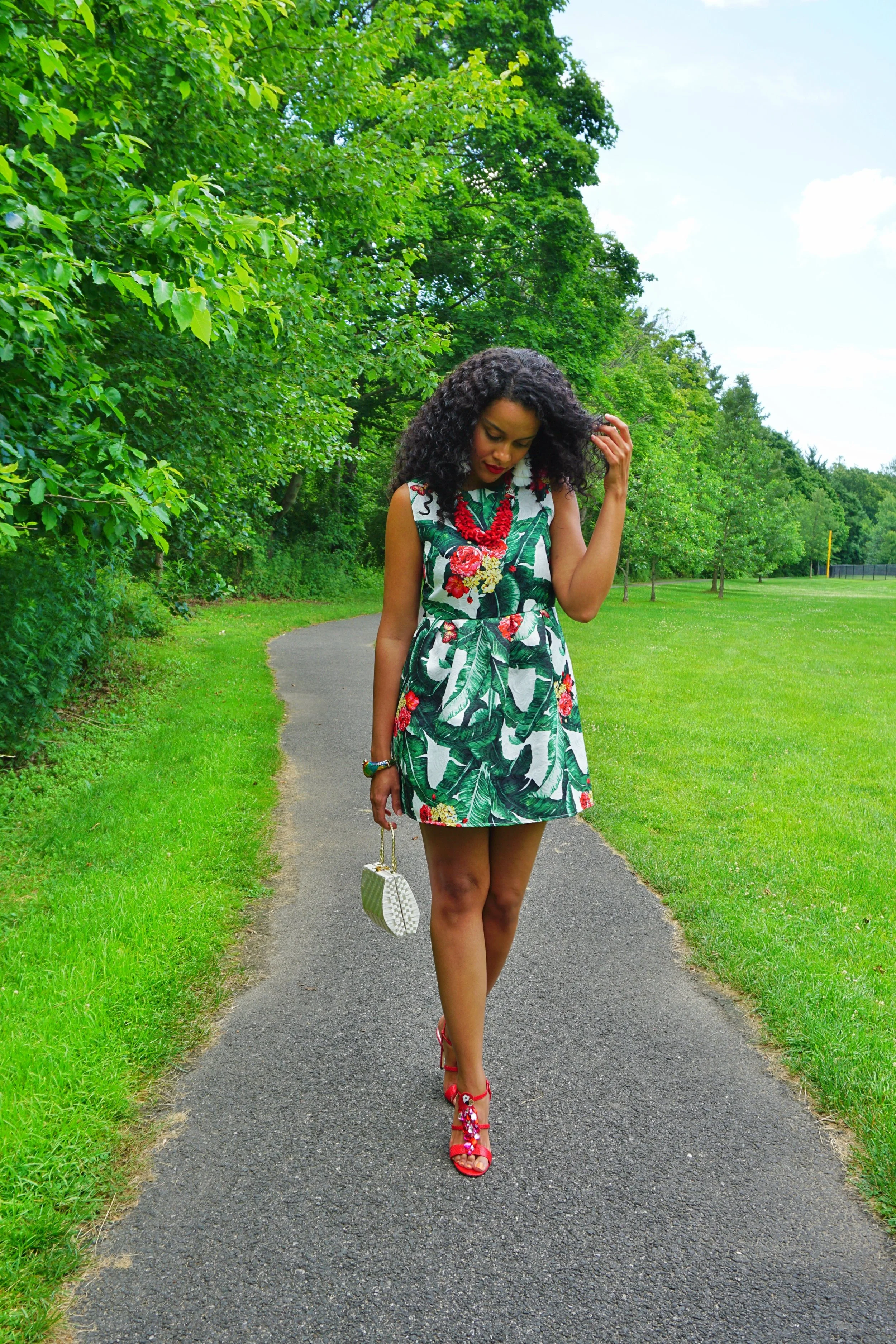 It's a super mini and I don't usually wear them. Being a vintage-lover, I often rock knee-length or midi pieces so this dress felt a little strange on. I wasn't used to the length but most importantly I didn't feel comfortable at first because I couldn't bend over. If I did, even in the slightest, my entire behind would be out for the world to see. This girl is not about that life, so I decided I wouldn't keep the dress. Yes folks, I wasn't going to keep this dress I styled in this shoot but I glanced at it one more time and couldn't resist the lure of the (drumroll please) banana-leaf print!