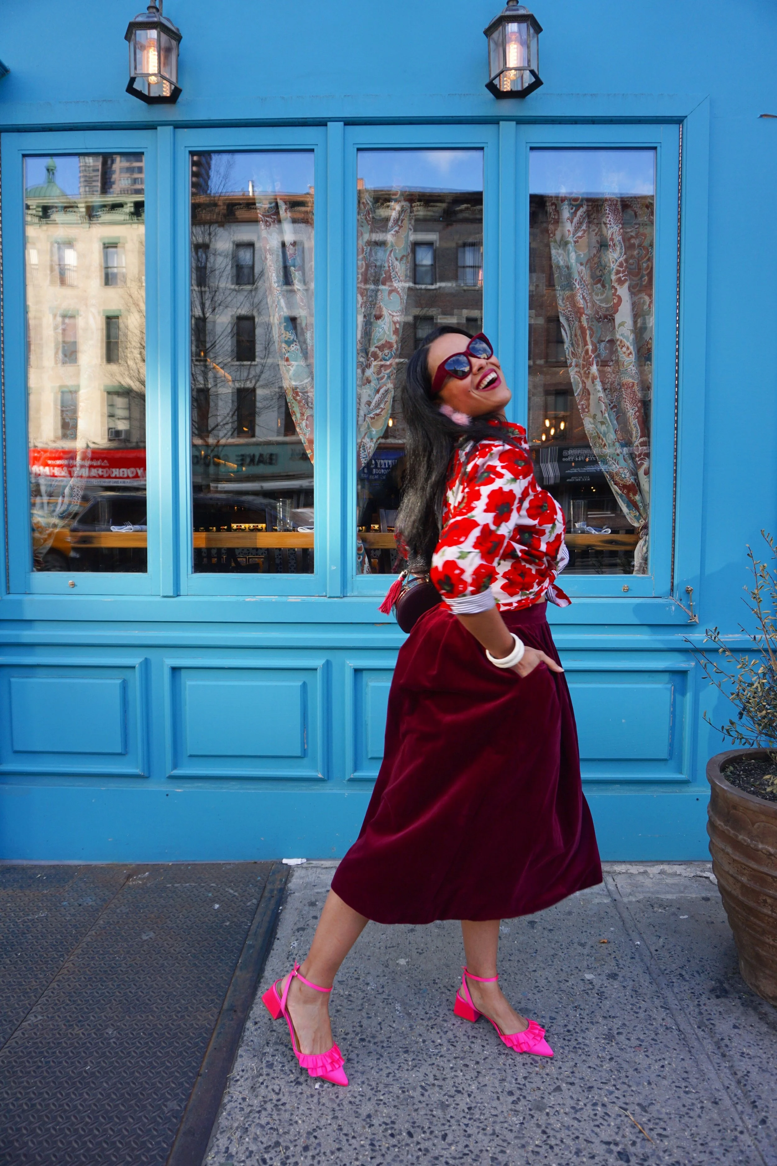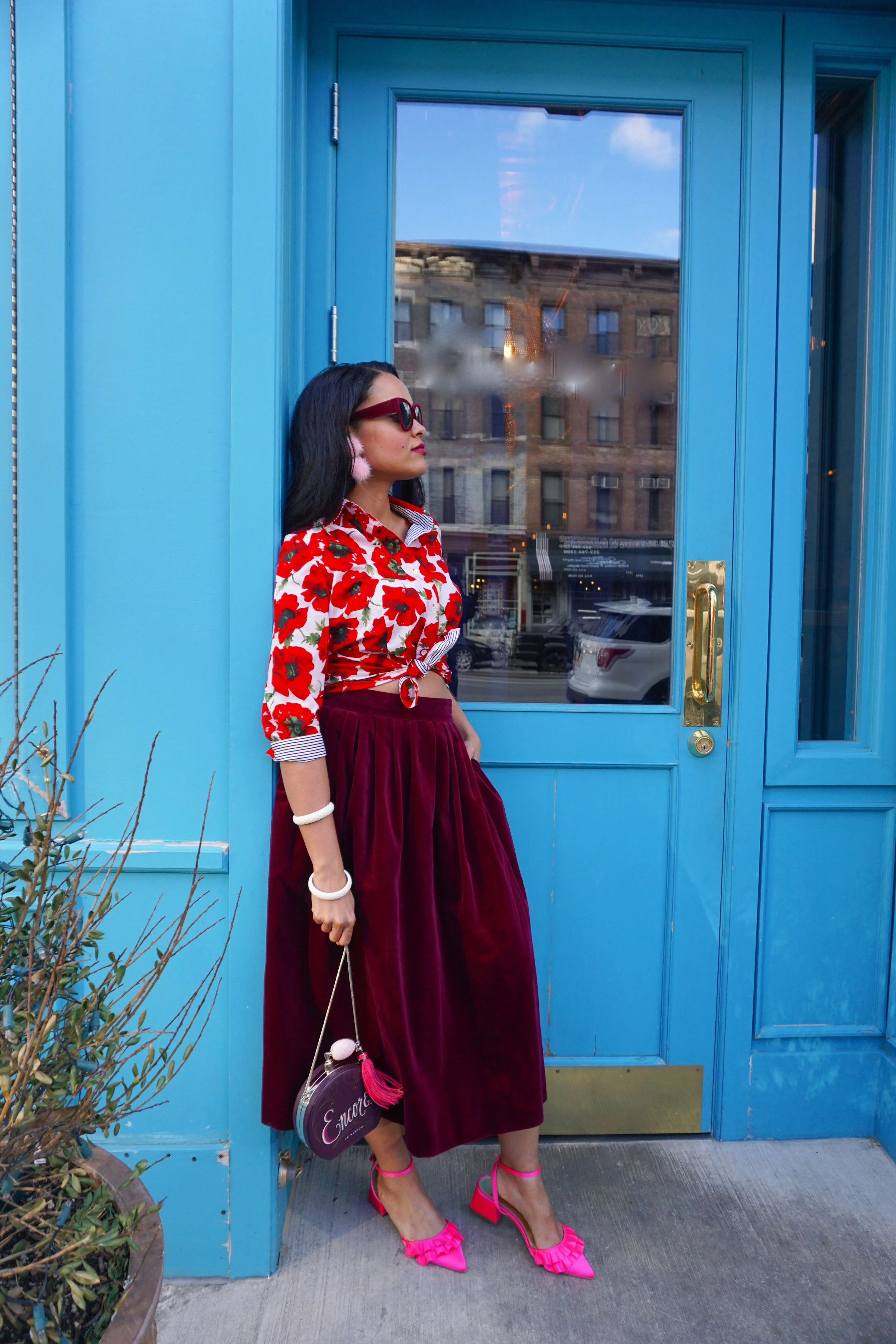 To accessorize I added my perfume atomizer purse, shocking pink ruffle flats, thrifted bangles, fuzzy pompom earrings and velvet sunnies.