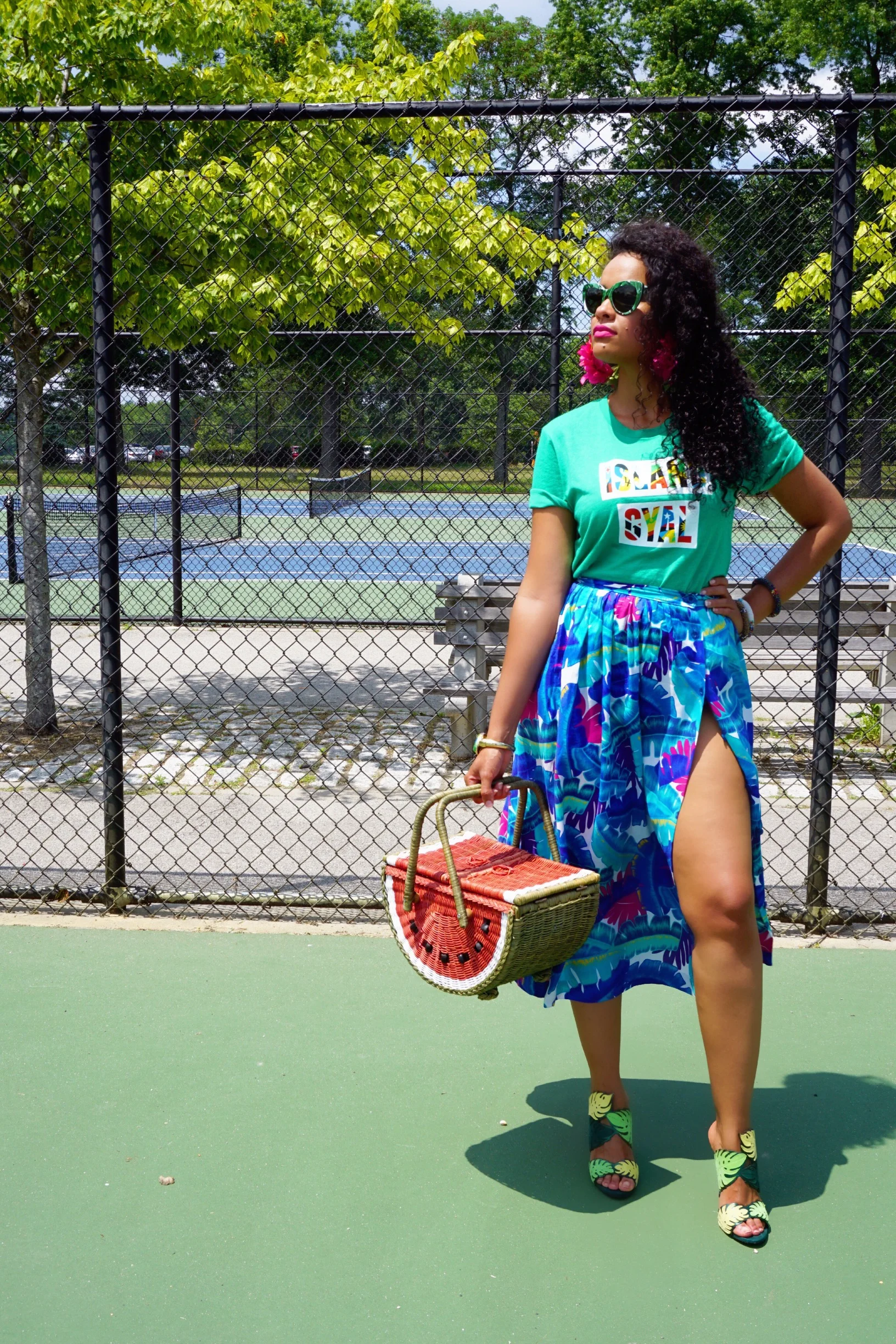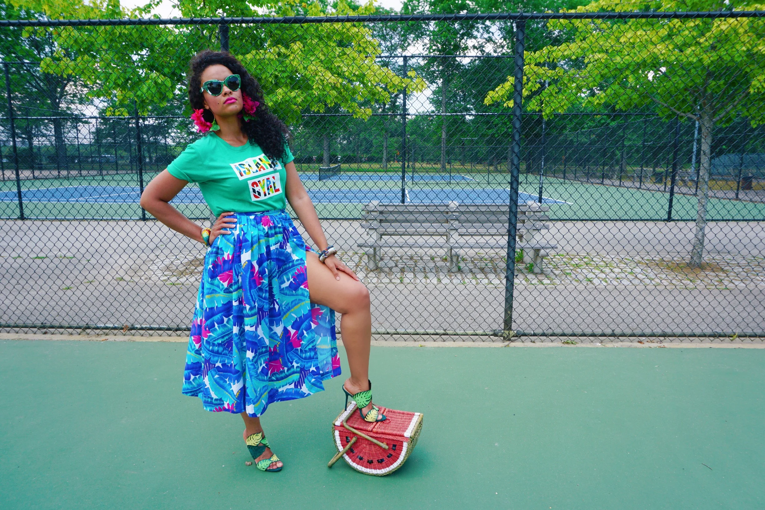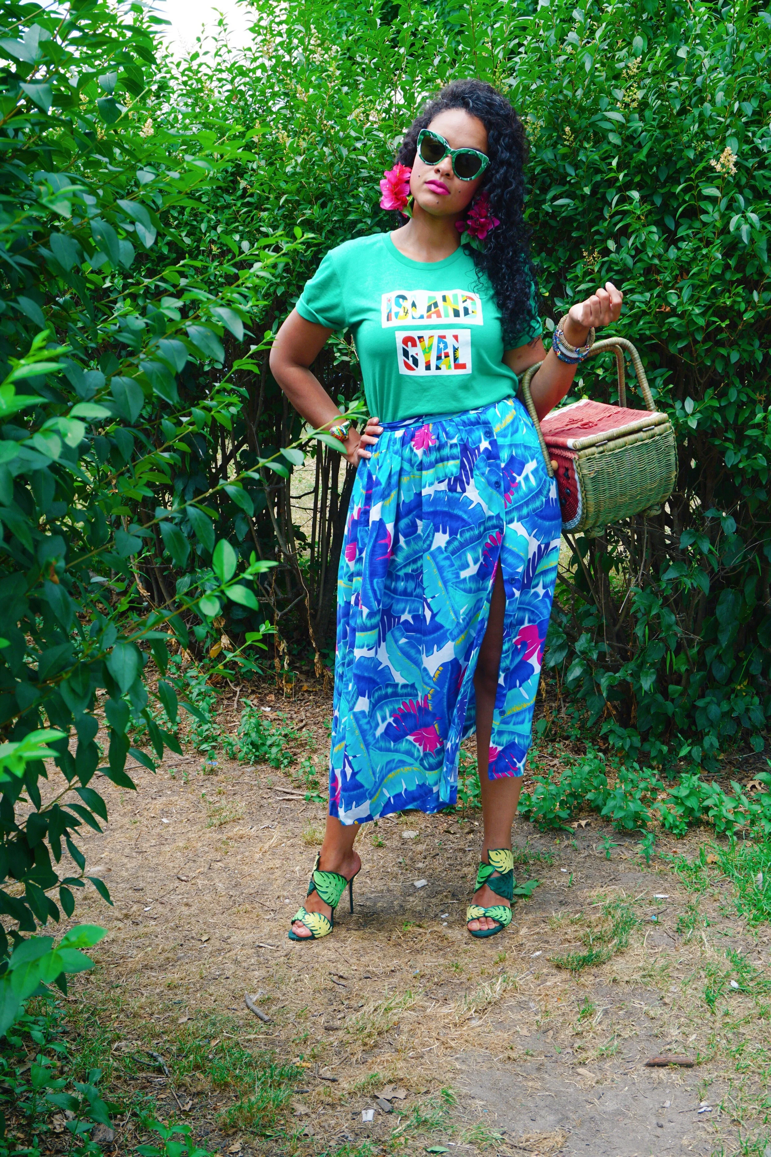 My skirt is a vintage banana leaf button front skirt I got earlier this year from a lovely Etsy shop called Comin In Haute. I twisted the skirt so the button could sit on top my leg for a different look and left a few open for some Summer sizzle. My heels are last year from Zara, my watermelon purse is actually a picnic basket I use as a purse and you can read more about it here. Bangles are a mix of beaded african bangles and the other is a Macaw hinge bracelet. Sunnies are Dolce Gabbana banana leaf print and my Bougainvillea hoops are handmade by yours truly!