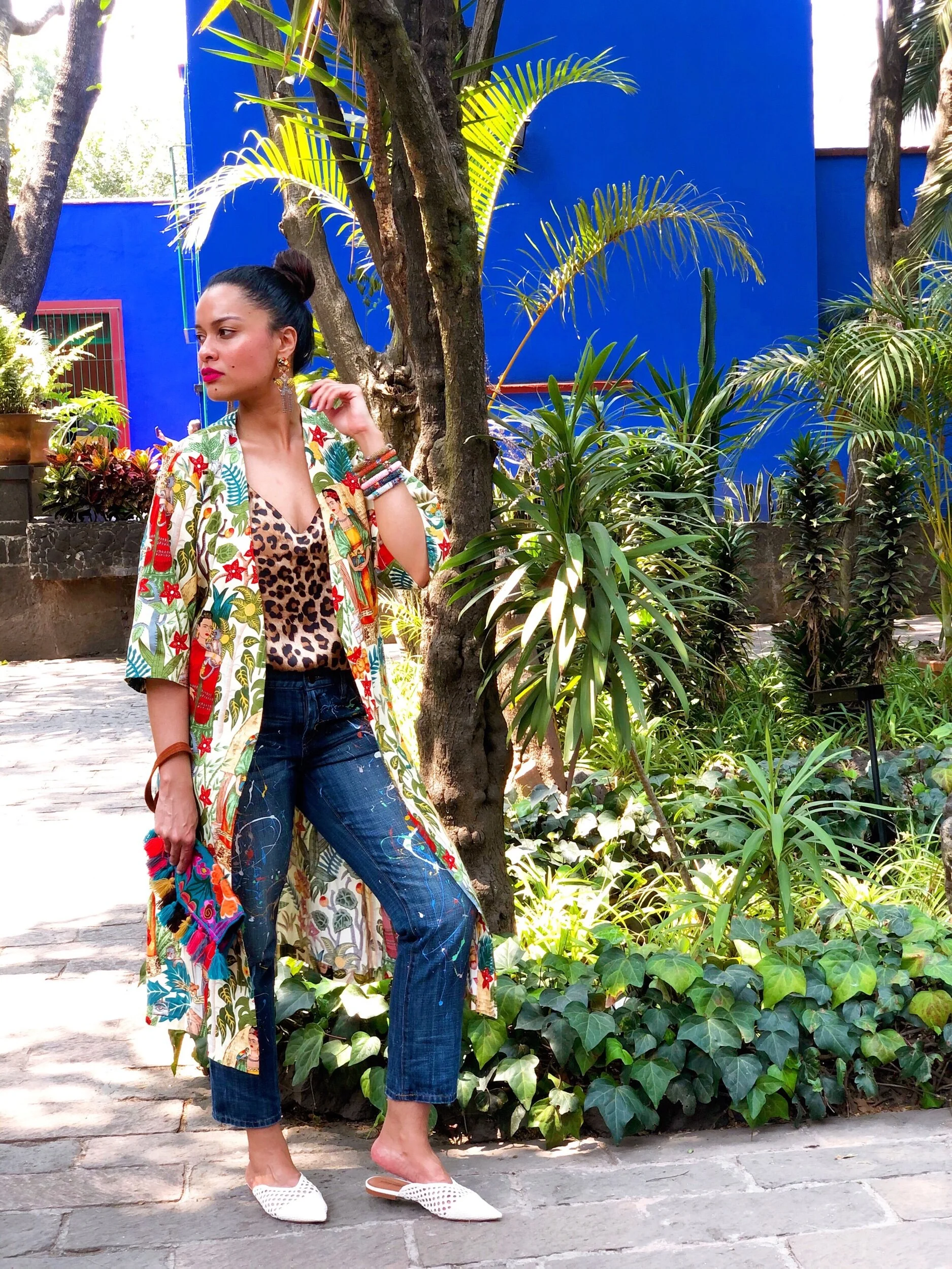 I finally wore my Frida-printed robe with a satin leopard camisole, paint splattered jeans (because hashtag artist things) and accessorized with my Frida/Carmen Miranda rhinestone earrings, leopard cat-eye sunglasses, African Maasai beaded bangles, embroidered Guatemalan tassel clutch from my big sis and woven lattice patterned flats.