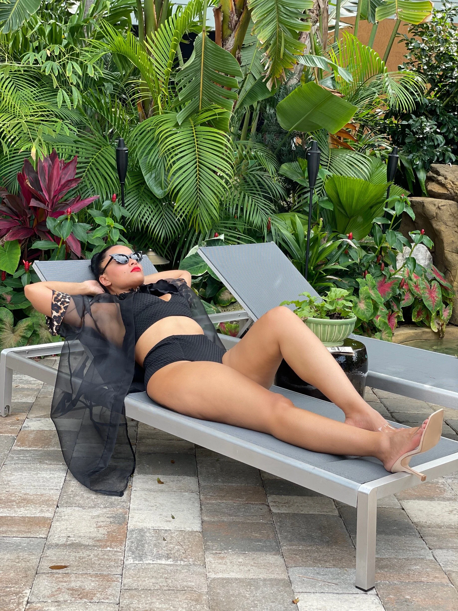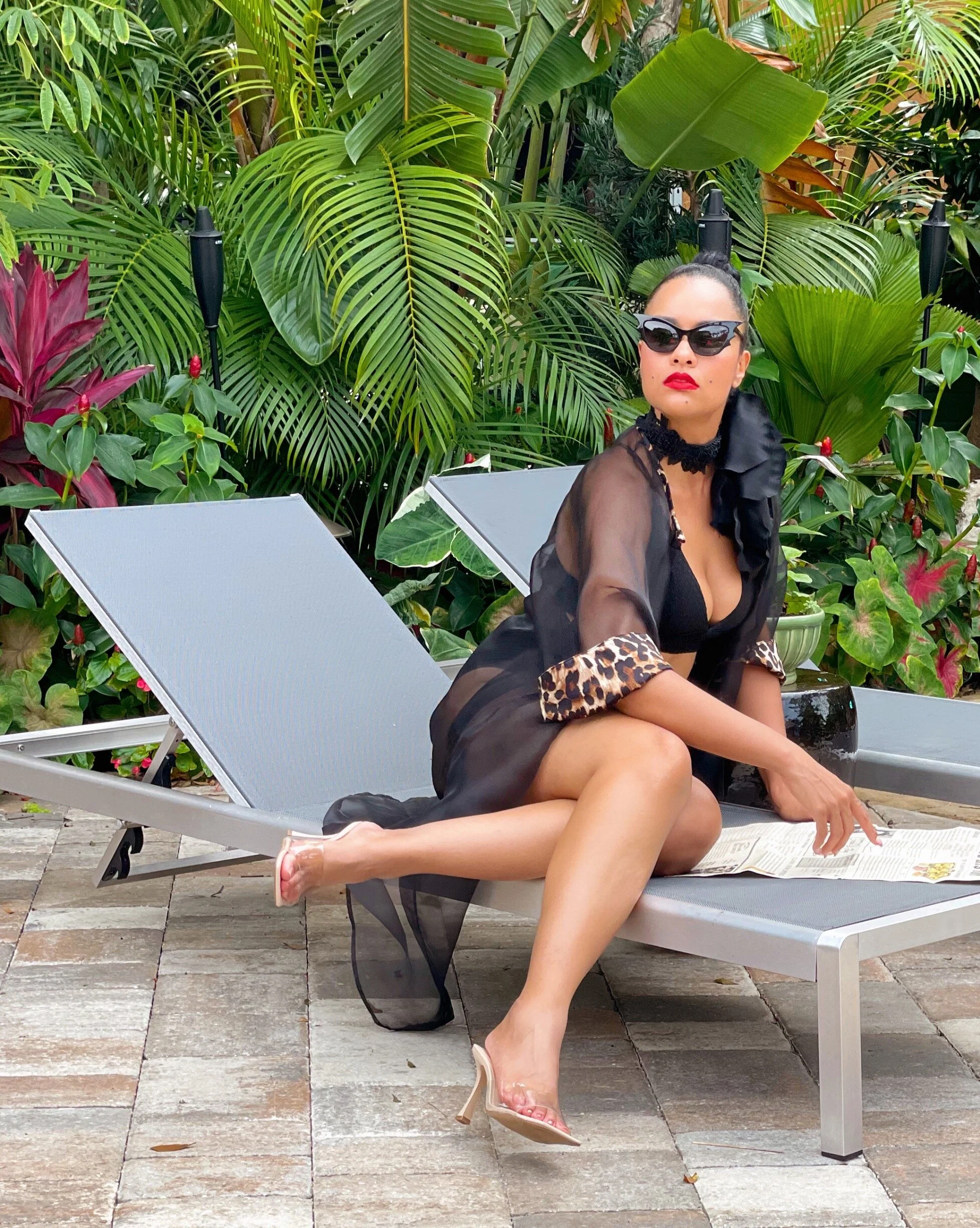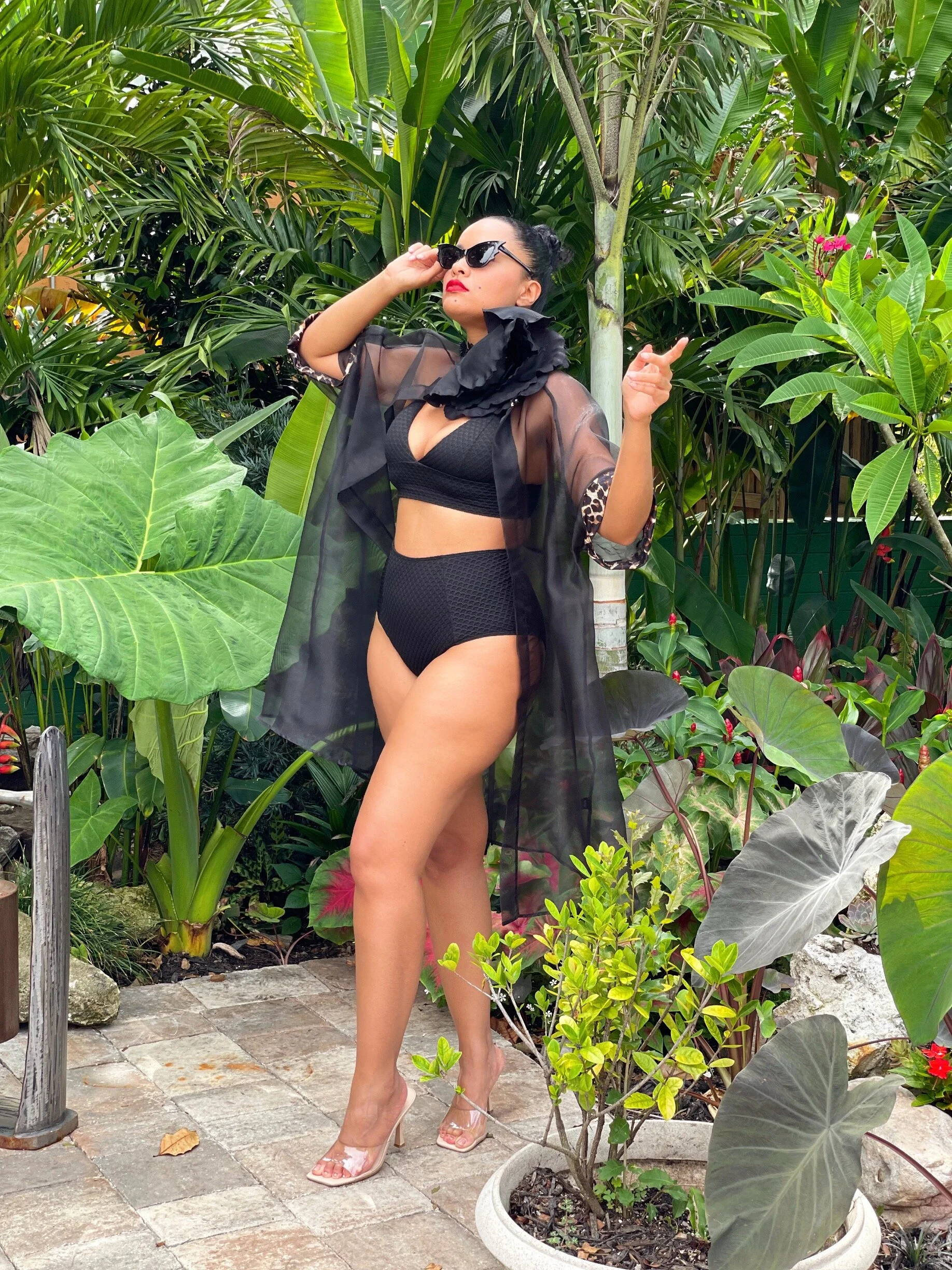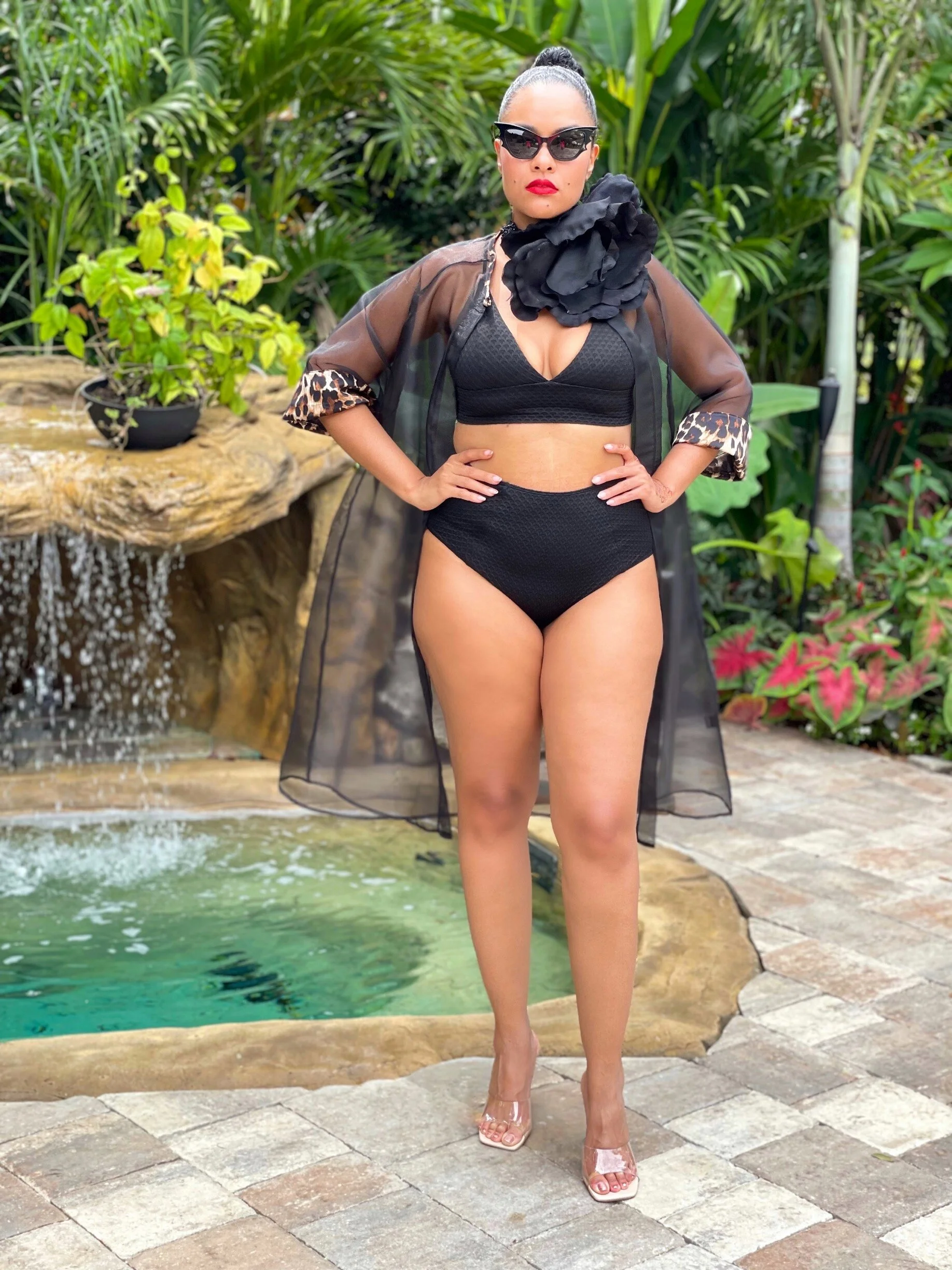 My swimsuit is about 6 years old, bat sunnies are second-hand, organza leopard cape is part of a set from Vintage Vandalizm and my giant black rose choker is a custom piece made by moi!