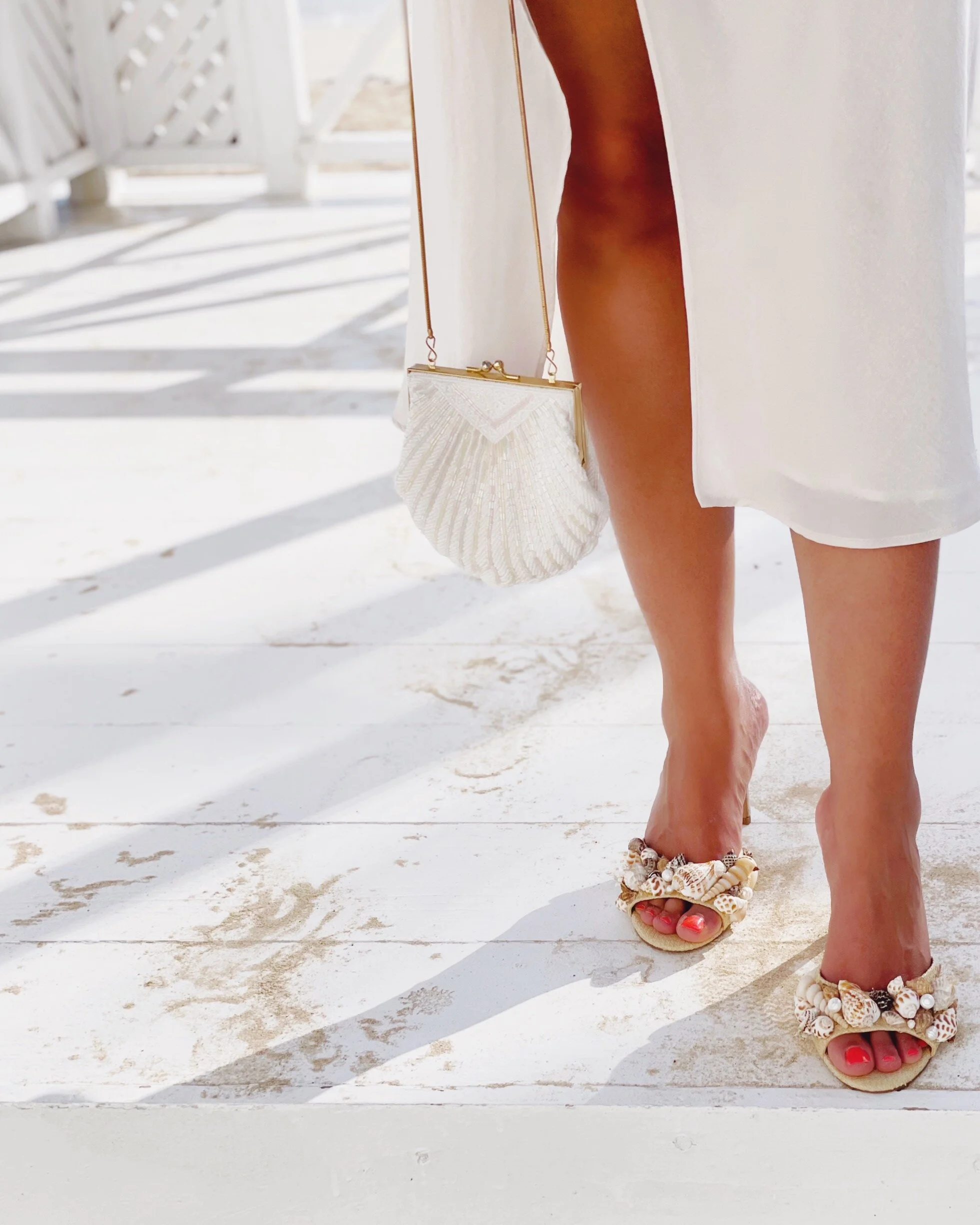 To play up the beach theme, I added seashell accessories including a gold starfish cuff (oldie), vintage beaded clamshell purse as well as shell heels and matching statement earrings both designed and made by me.