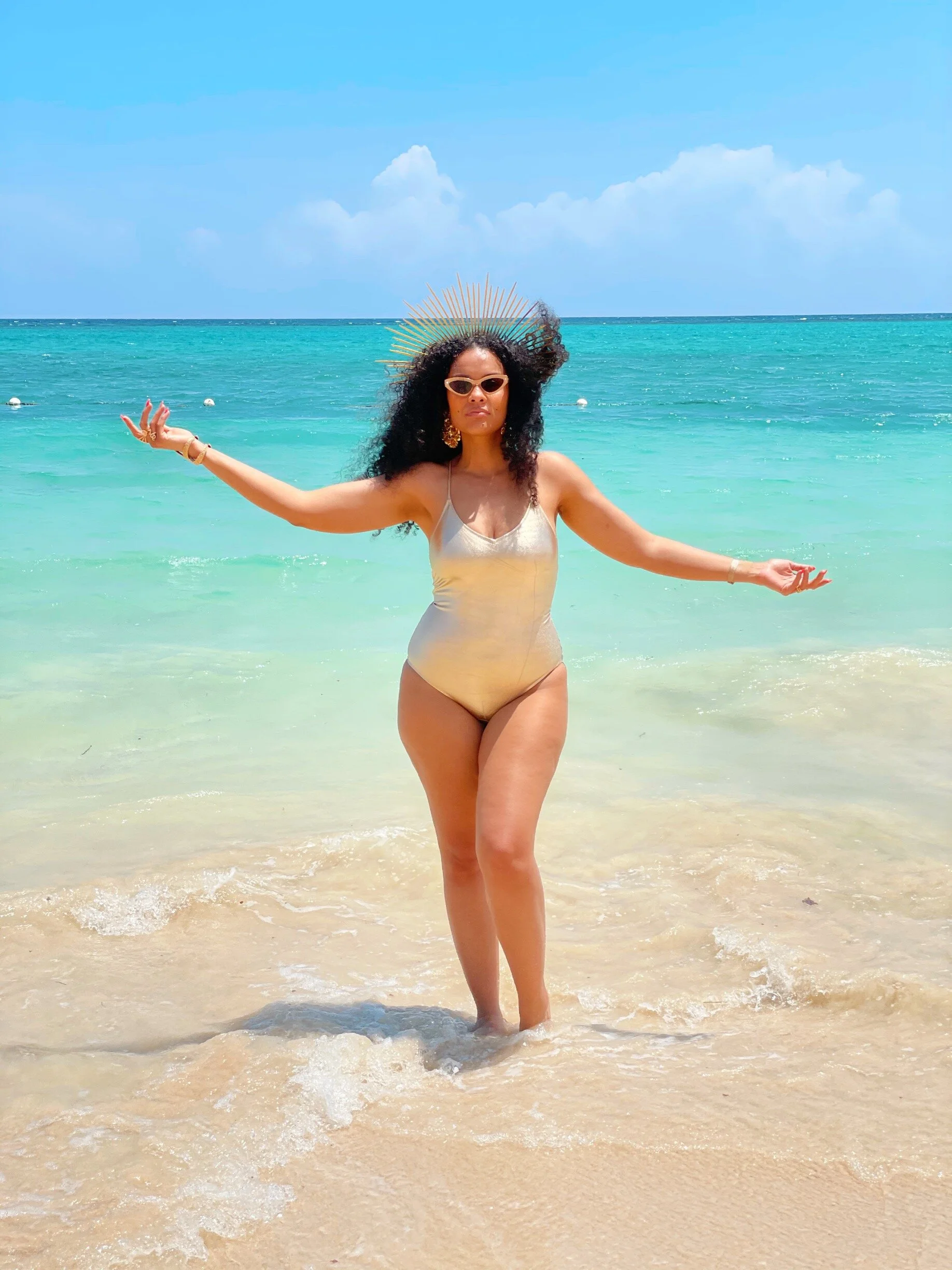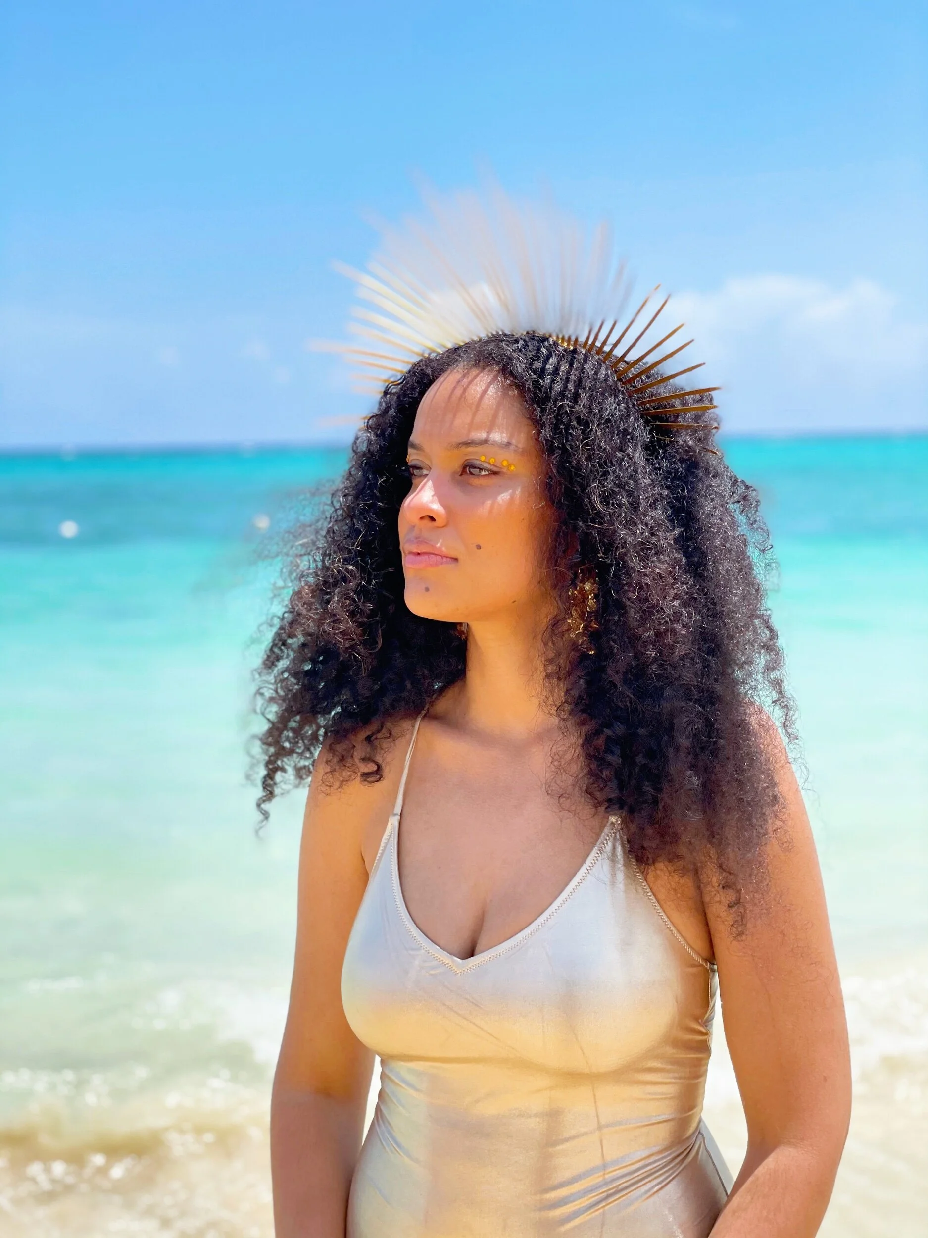 Shooting this swim look on a very windy beach day was quite the funny challenge. My hair kept blowing and tangling in the hair crown, the sun was bothering my eyes so I kept squinting, making funny faces and rubbing them which meant I essentially rubbed off all my eye jewels (insert eye roll and laughter simultaneously). By the end I was thoroughly done and yanked off my headpiece before retreating to a beach chair to relax.