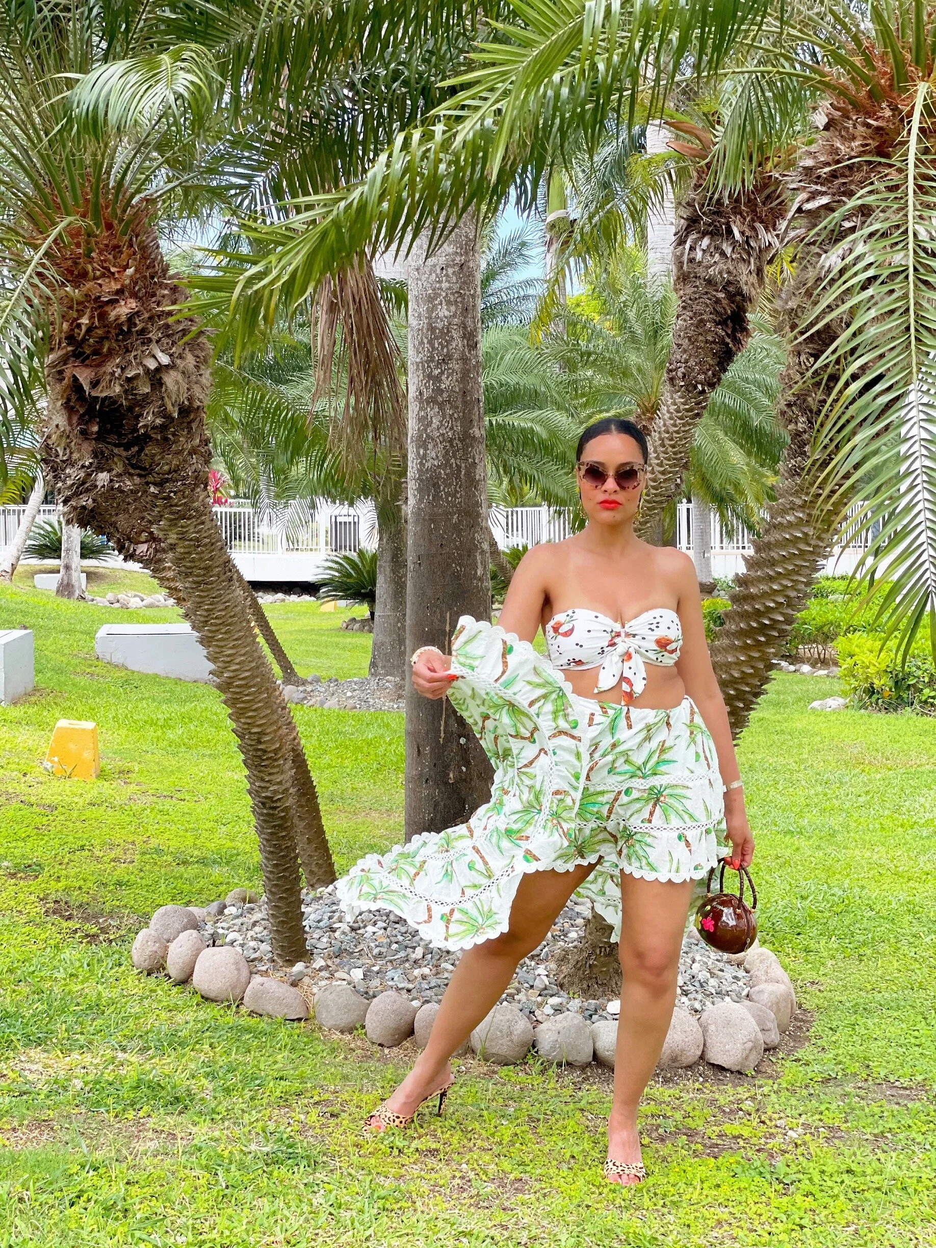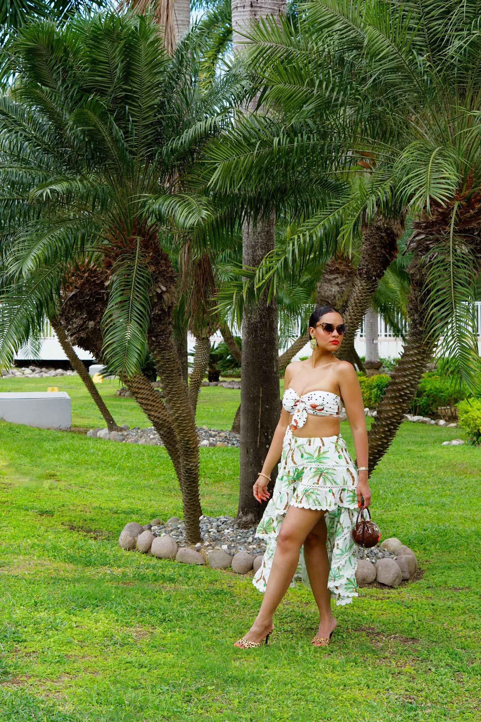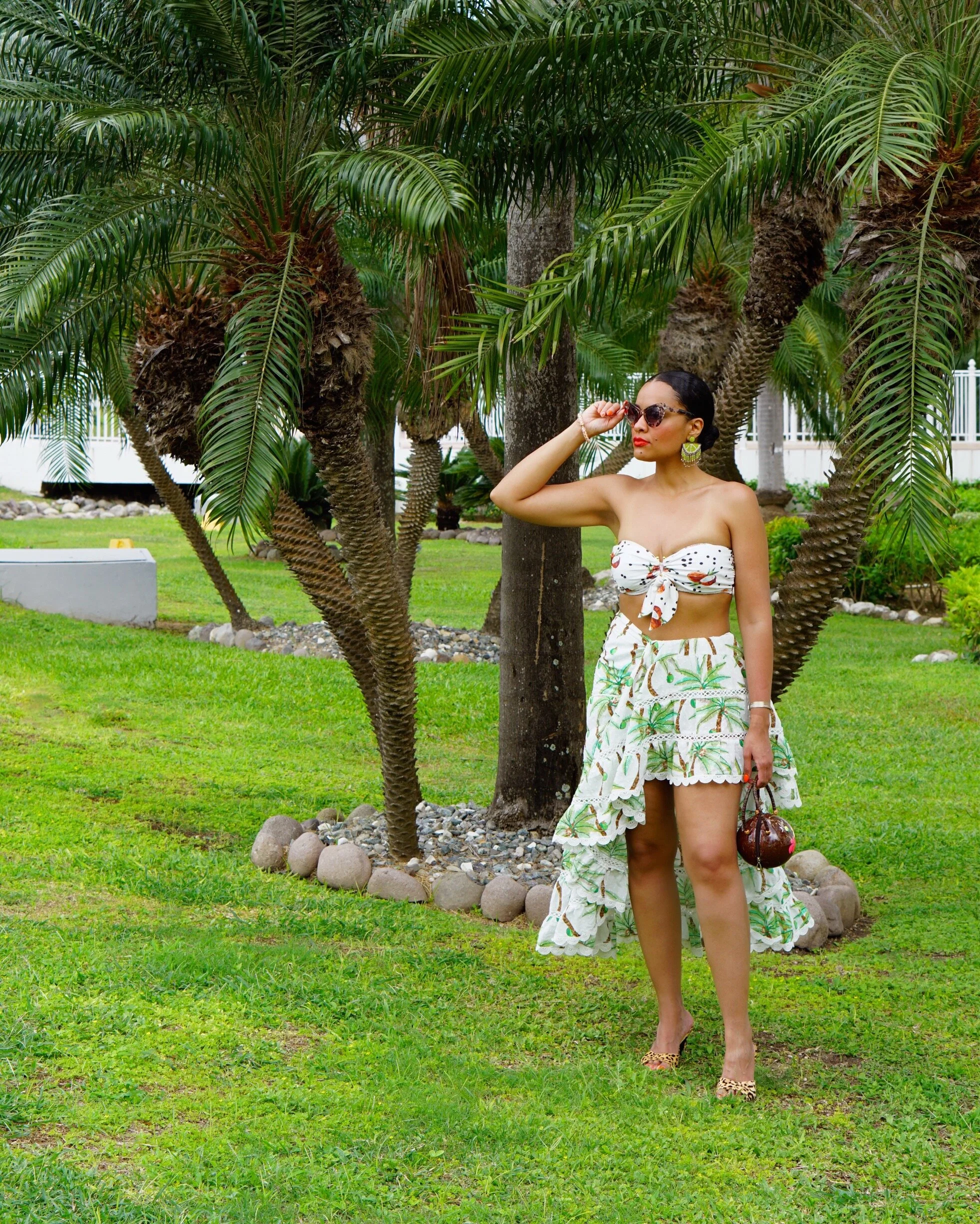 As you can probably guess by now, this one is a play off the song lyrics put the lime in the coconut (no clue what that really means). My earrings are from a small online boutique and sold out (sorry), the giraffe hinge bracelet is by Kenneth Jay Lane and my coconut purse is vintage. I linked to similar pieces in the widget below so you can get the look!