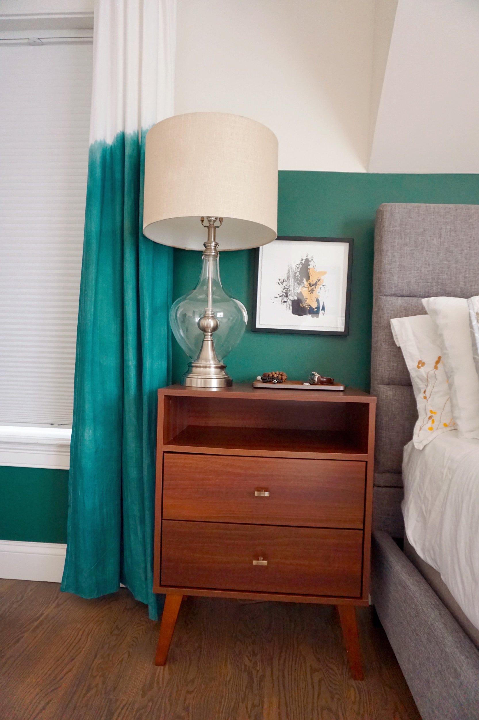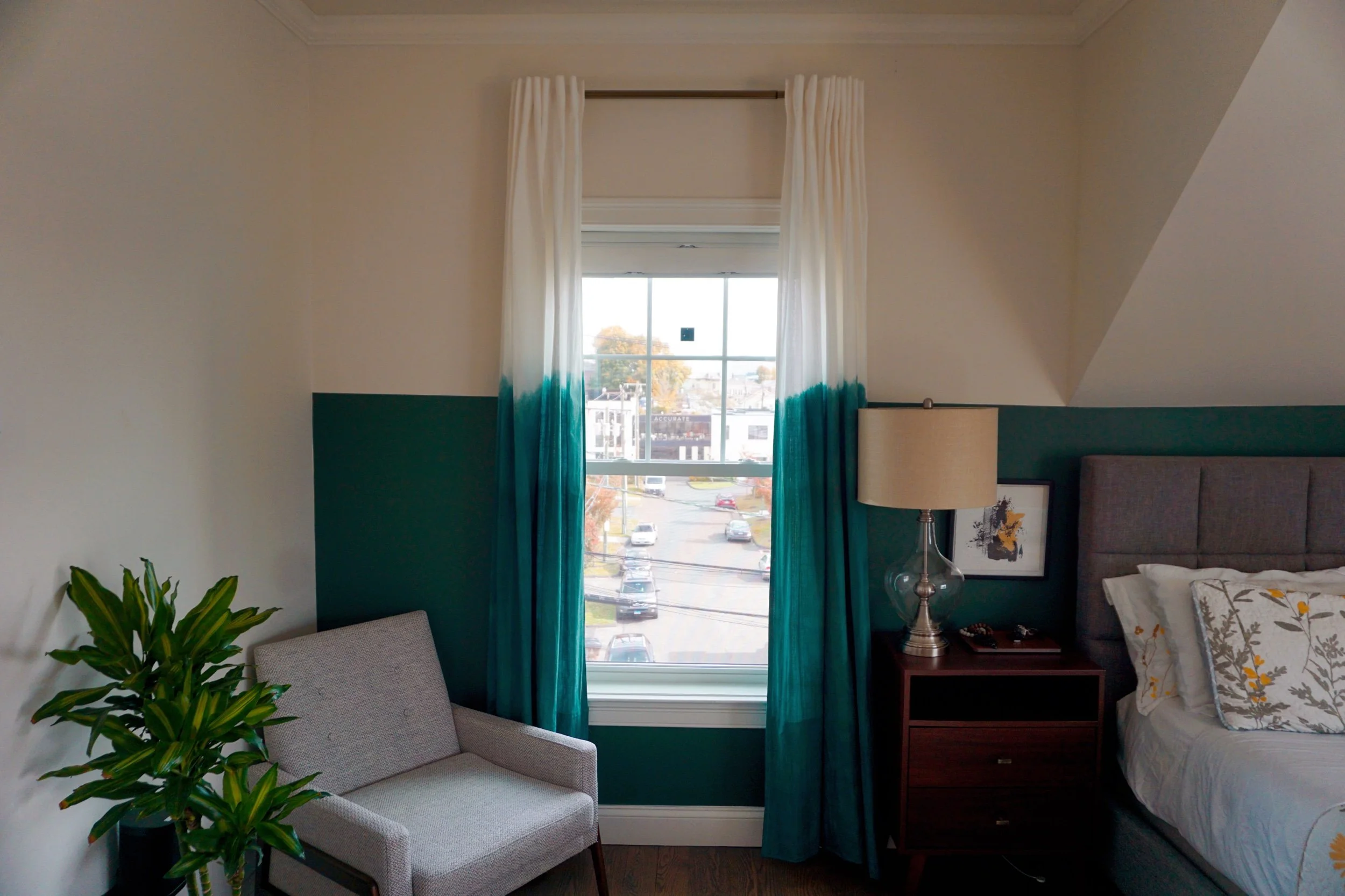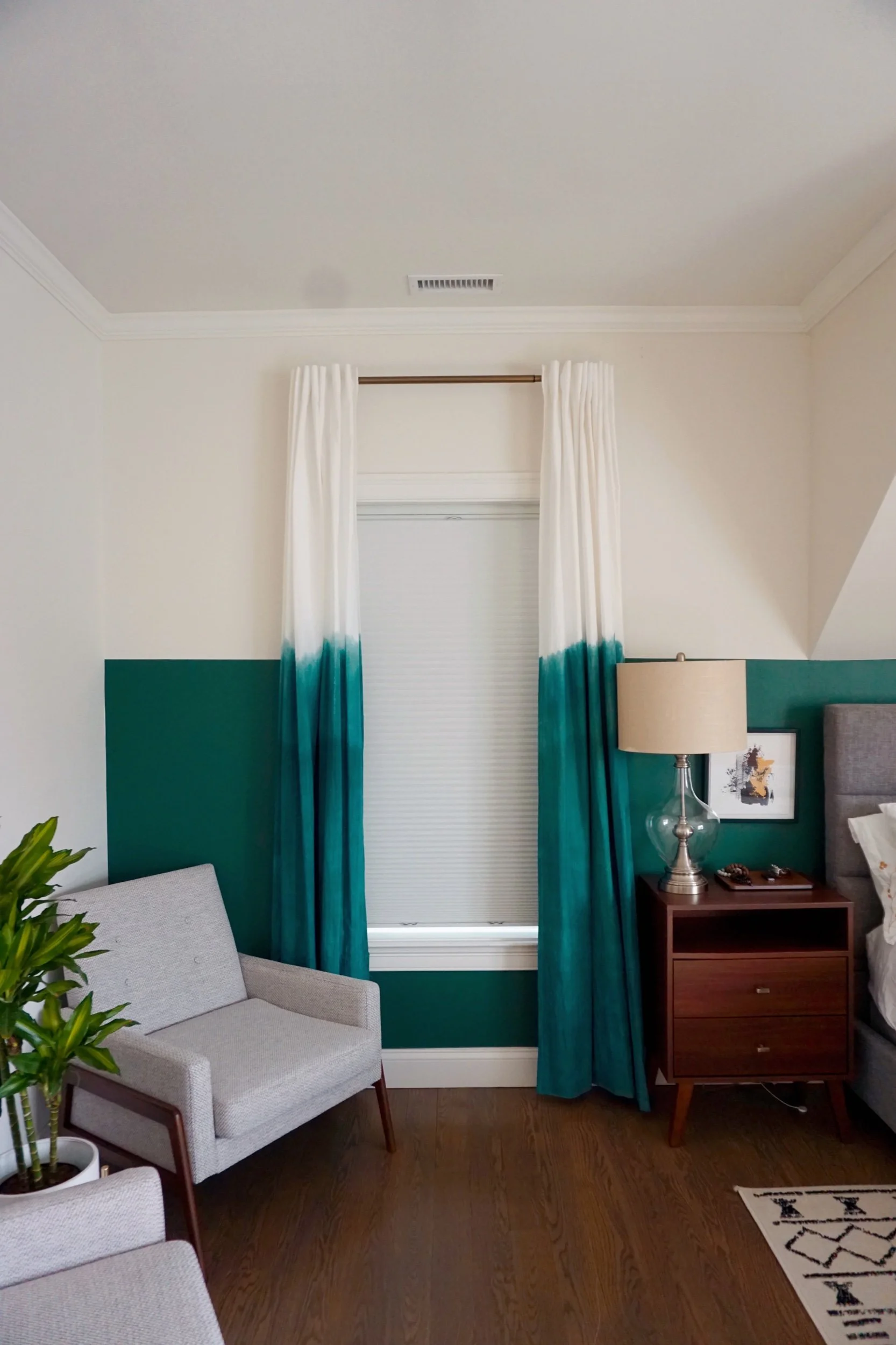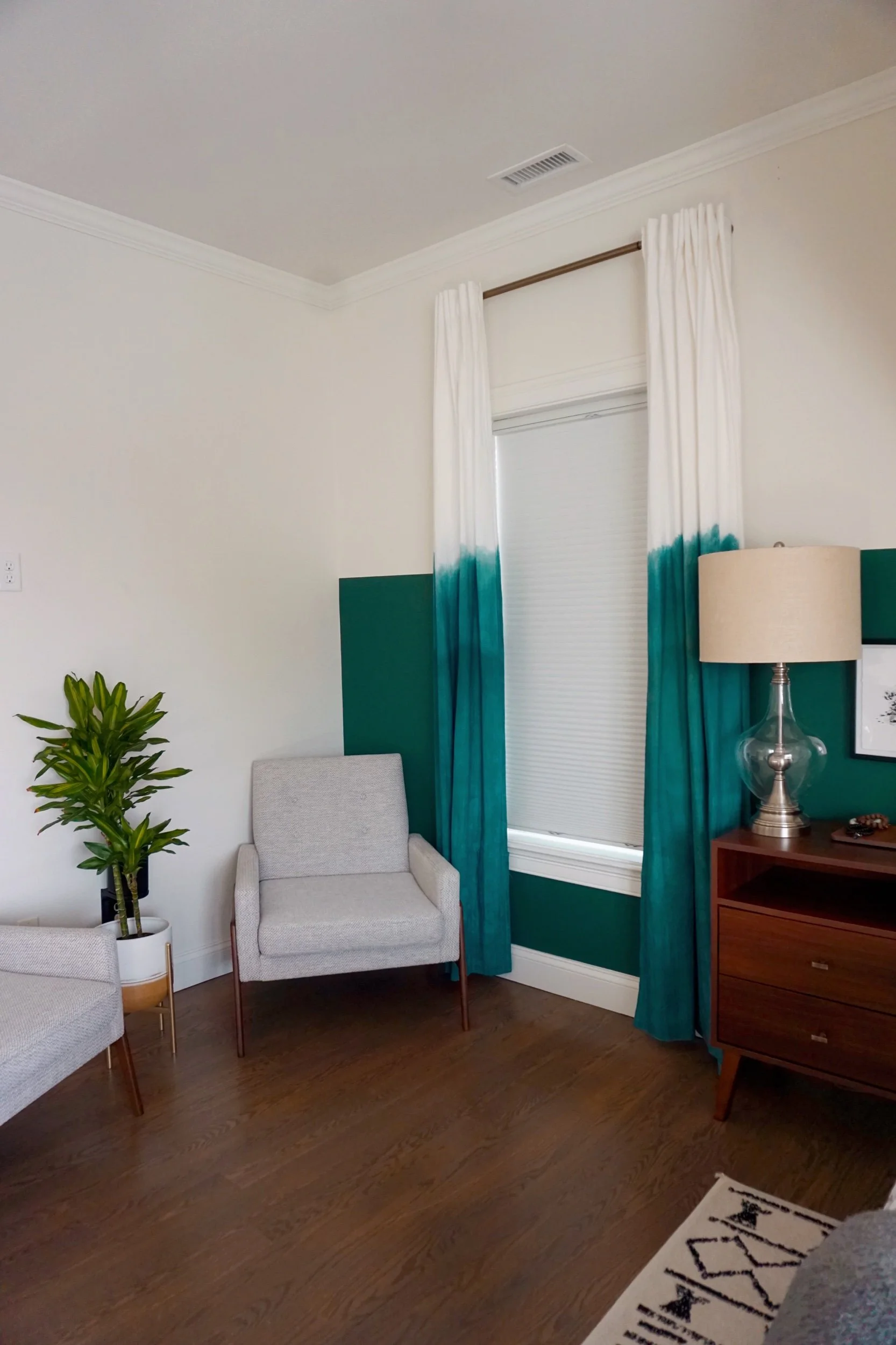 I also custom dyed curtains to play off the wall design but wanted it to have more of an organic dip-dyed effect vs. the sharp straight line. To achieve the custom green color, I mixed a couple of green-based dyes to get as close to the wall paint color.