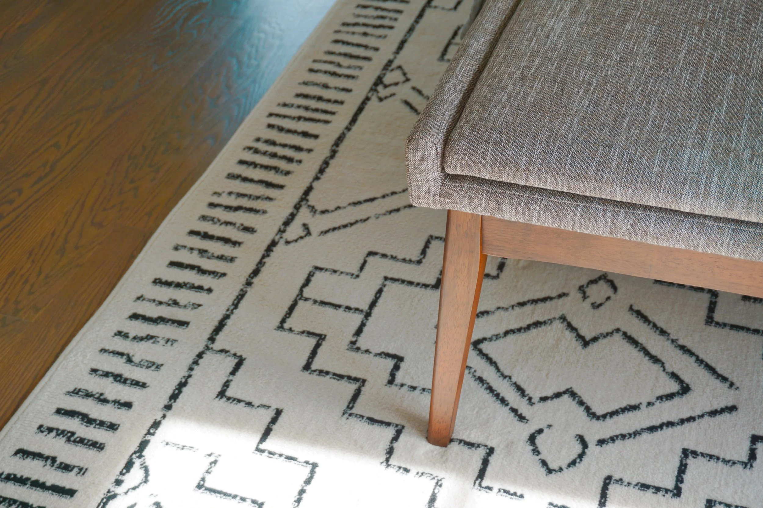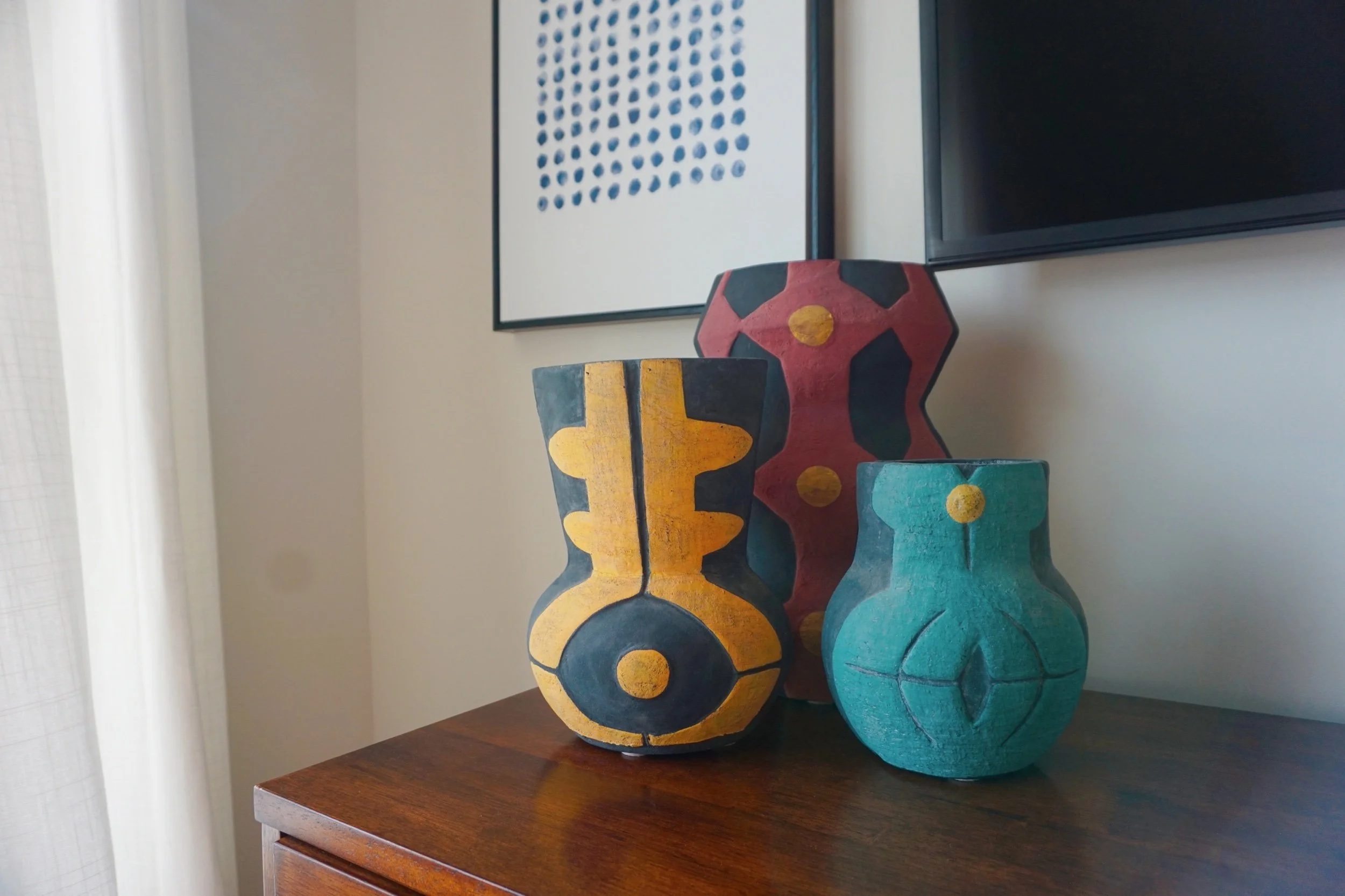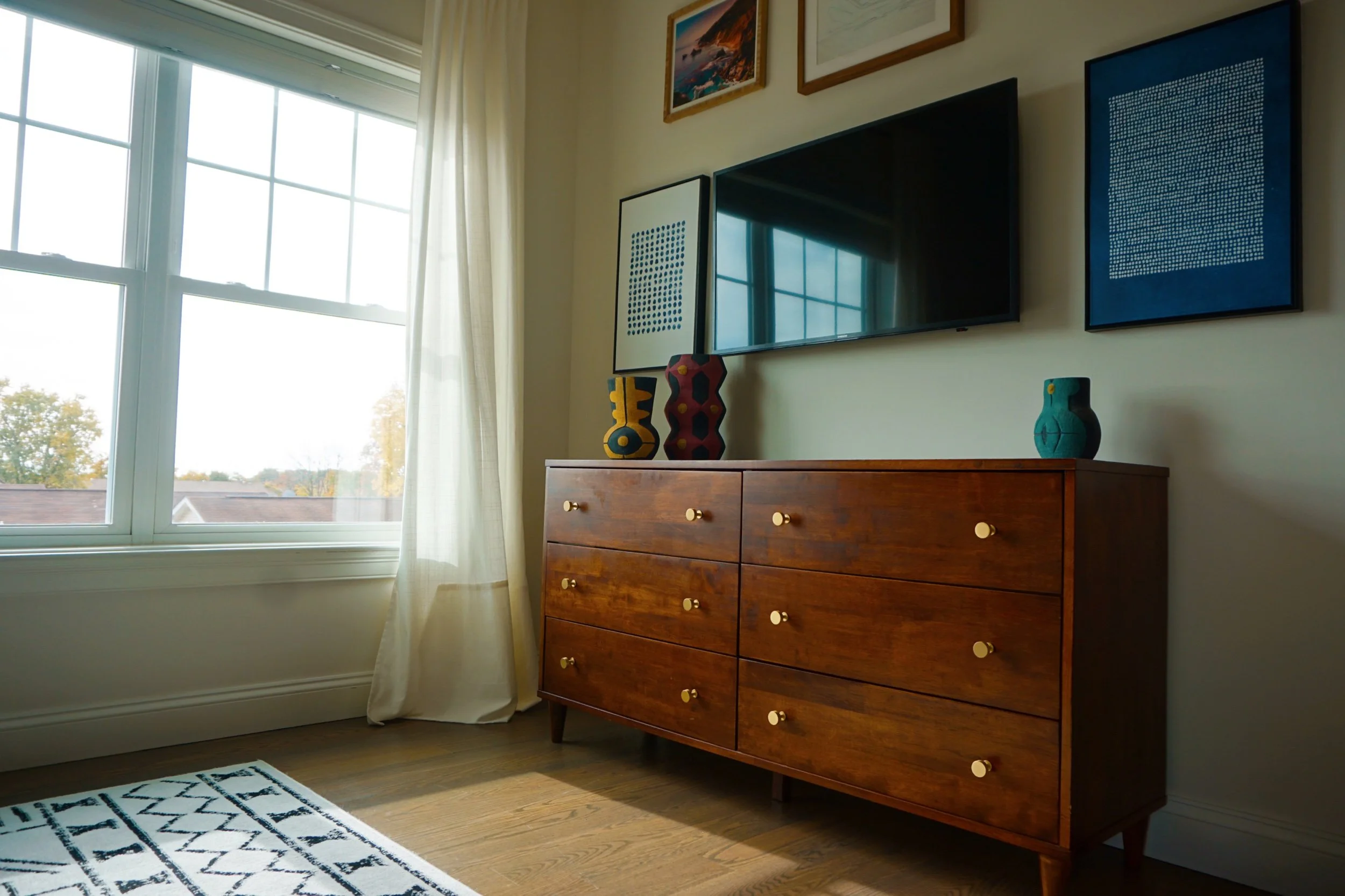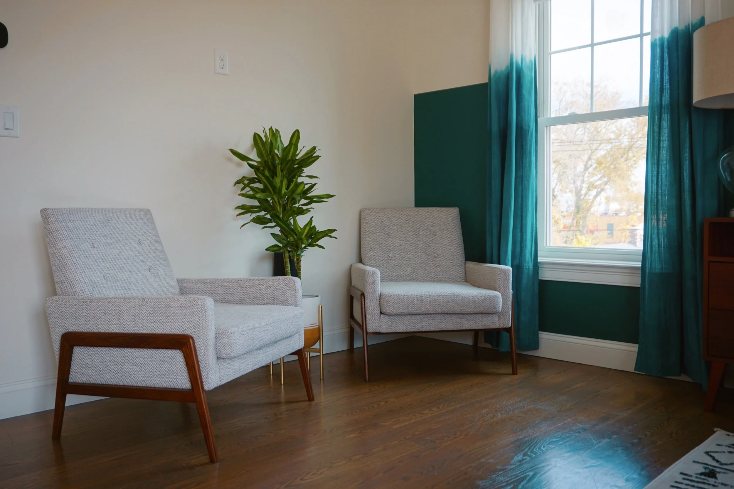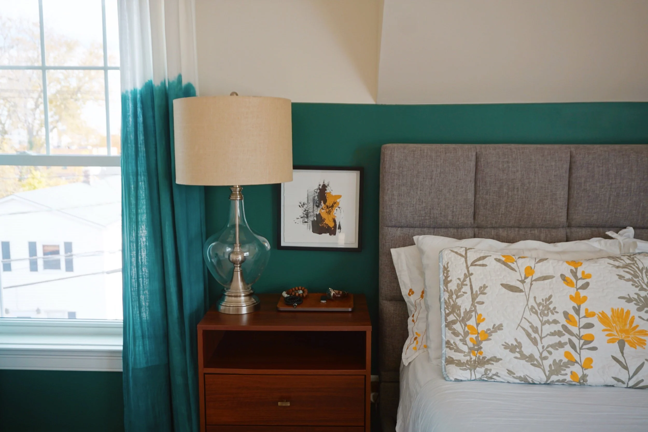 I also custom dyed curtains to play off the wall design but wanted it to have more of an organic dip-dyed effect vs. the sharp straight line. To achieve the custom green color, I mixed a couple of green-based dyes to get as close to the wall paint color.