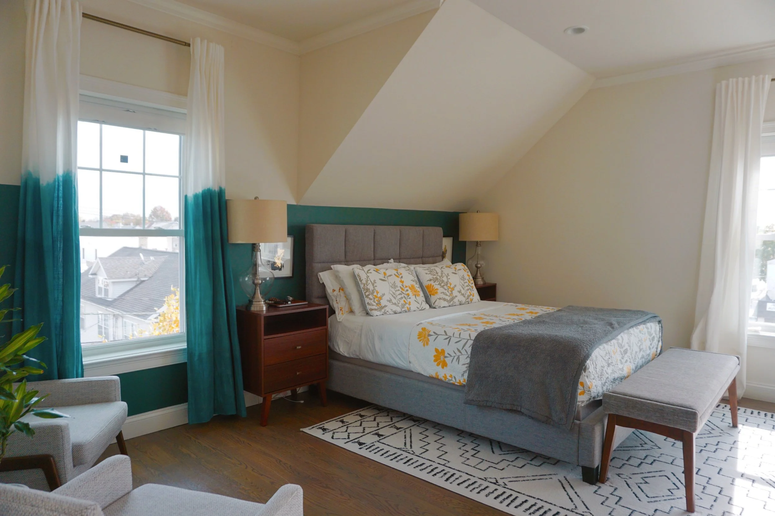 When I initially took on this project, painting walls was not part of the plan. The couple wanted to keep the walls as is, but with a little convincing they agreed upon this green accent wall that helped to elevate the room and bring character to an oddly shaped wall. The goal was to trick the eye to focus away from the slanted ceiling.