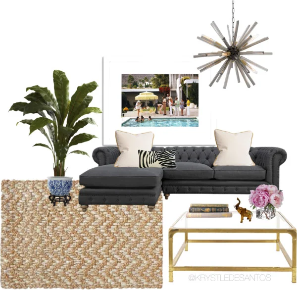 The first board is my favorite and I want my living room to look like this. The chesterfield sectional, chandelier and gold coffee table add lots of glamor to the space while the banana leaf plant and Slim Aarons Poolside party photography provides a cool tropical retro vibe.